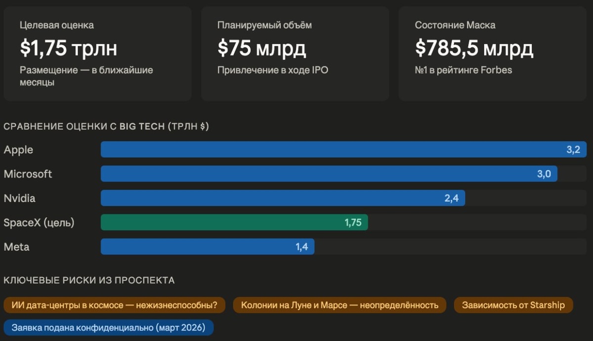 В конфиденциальной заявке на IPO SpaceX предупредила, что её планы по размещению дата-центров для ИИ на орбите, а также по созданию колоний на Луне и Марсе могут оказаться коммерчески нежизнеспособными. Инициативы связаны с непроверенными технологиями и находятся на ранней стадии разработки. Это прямо противоречит публичным заявлениям Илона Маска: в январе на Всемирном экономическом форуме он называл космические дата-центры «очевидным решением» и обещал, что уже через 2–3 года это будет самый дешёвый вариант размещения ИИ-мощностей.