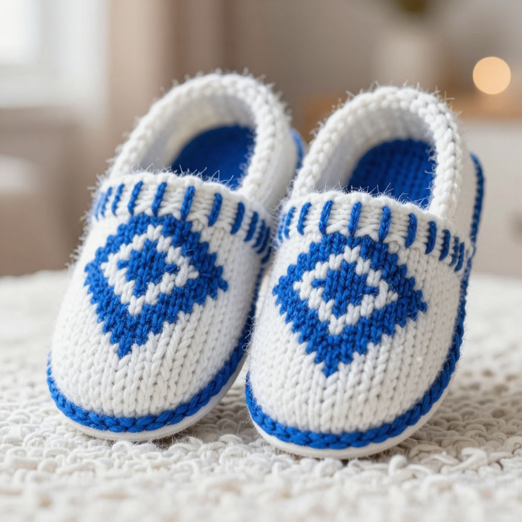 У вас получились уютные вязаные тапочки с красивым узором «ромбы». 🧦