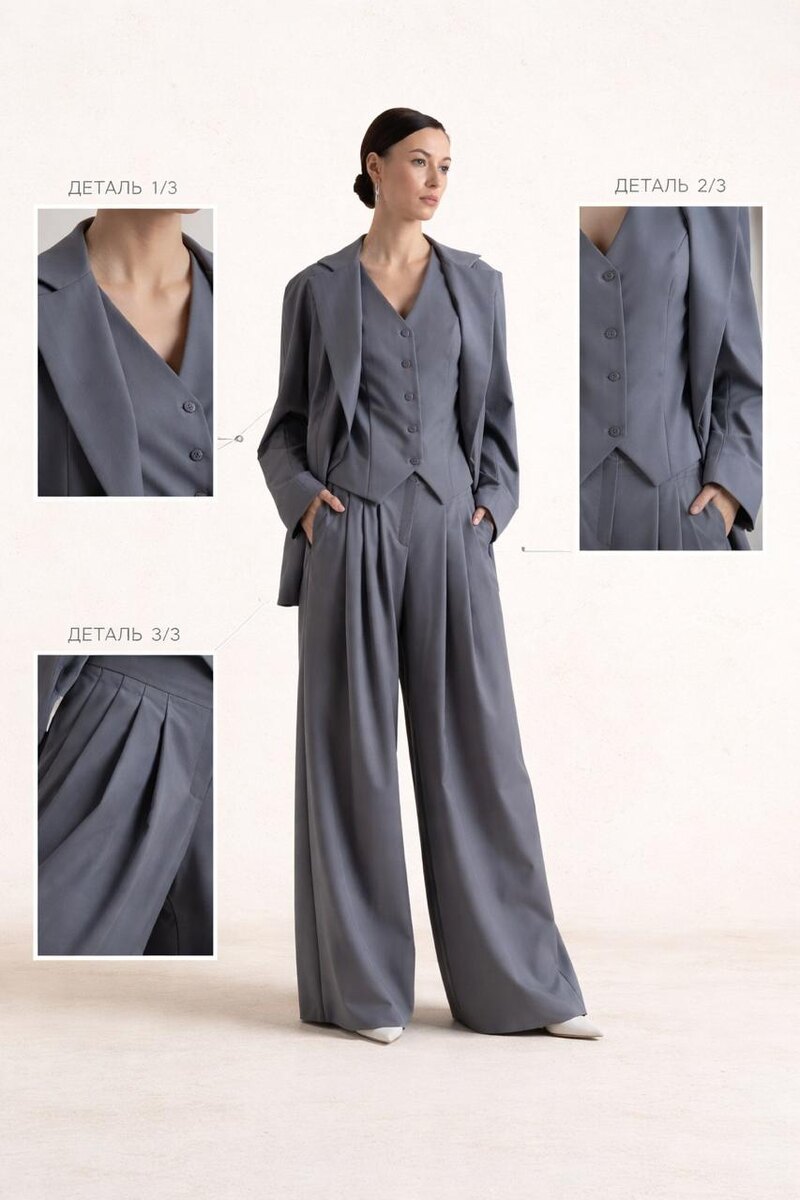 Костюм-тройка «Колоннада» производит впечатление с первого взгляда. Это полноценный самодостаточный образ, продуманный и выверенный, с акцентом на форму и детали, которые раскрываются постепенно. Сложный крой и пластика ткани Для создания комплекта использован смесовый материал вискозы с сизалью — он сочетает мягкость и пластичность, позволяя форме сохранять архитектурность без жёсткости. Двубортный жакет с геометричным низом формирует чёткую линию и трансформируется в расстегнутом виде. Жилет с восходящими рельефами визуально вытягивает силуэт. Брюки с драпировкой добавляют динамику и пластичность. В результате создаётся цельный образ, в котором каждая деталь работает на Вас. Универсальность, которая экономит время Комплект «Колоннада» легко адаптируется под разные задачи. Вы можете носить его как полноценный костюм — для собранного и выразительного образа, — или сочетать элементы по отдельности с базовыми вещами. Жакет, жилет и брюки остаются самодостаточными и не требуют сложных