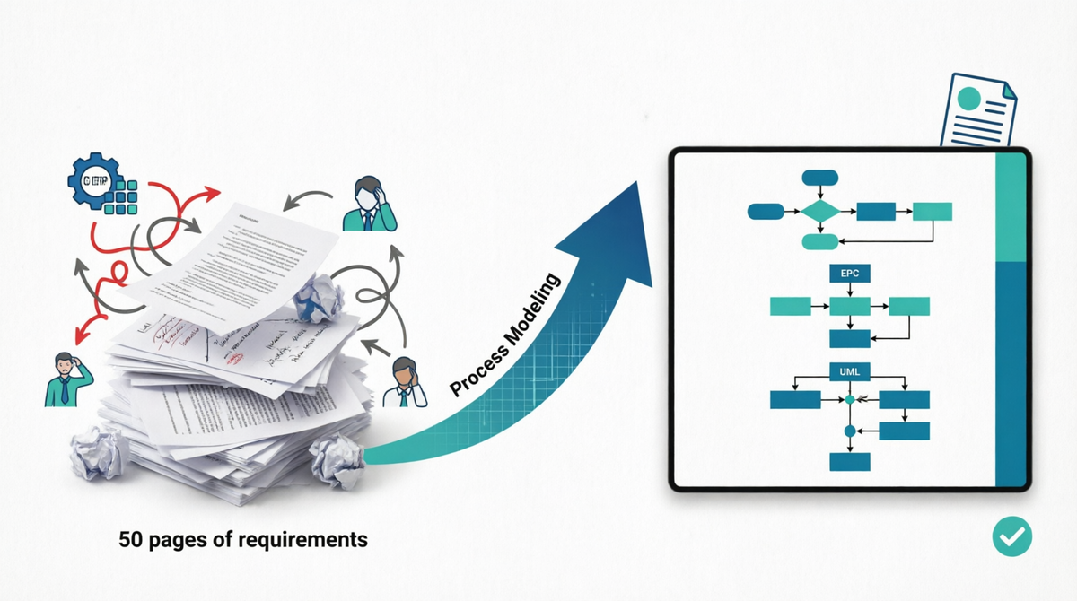 Выход из ситуации был найден в отказе от длинных текстовых ТЗ в пользу формального моделирования бизнес-процессов. Ключевым решением стал принцип «сначала схема — потом код». Вместо попыток угадать намерения заказчика, к