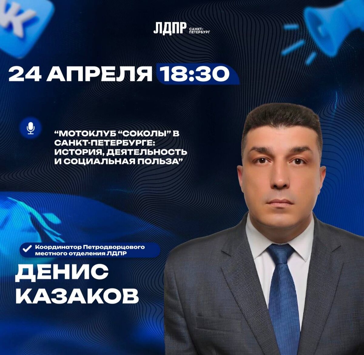 24 апреля в 18:30 приглашаем всех на прямой эфир во ВКонтакте с Денисом Казаковым. Тема эфира: «Мотоклуб «Соколы» в Санкт-Петербурге: история, деятельность и социальная польза». Денис Казаков - координатор Петродворцового местного отделения ЛДПР и руководитель мотоклуба «Соколы» в Санкт-Петербурге - расскажет о работе клуба, чем занимаются его участники, какую пользу приносят обществу и как развивается сообщество. Это отличная возможность узнать больше о локальных инициативах и о том, как увлечения объединяют людей на благо города. Не пропустите! Подключайтесь и задавайте вопросы в прямом эфире. 🔗 Мы ВКонтакте 🔢 Мы в МАХе 🖥 Сайт ЛДПР | Санкт-Петербург