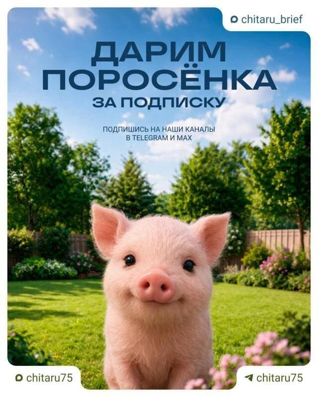 ! Уже завтра рандомайзер подведёт итоги народного розыгрыша от @chita.ru, победитель получит живого поросёнка. Чтобы малыш достался именно вам, нужно выполнить максимально простые условия, подписавшись на наши каналы в МАХ: ➡️ Основной новостной канал. ➡️ Канал «Истории Дальнего Востока и Сибири». 💙Обязательно переслать конкурсный пост другу и нажать под ним кнопку «Участвую». Если победитель будет из района, мы найдем способ вручить ему приз. Удачи! ✨