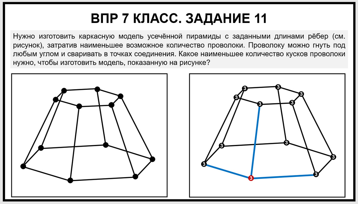 Разберём задание 11 из реального варианта ВПР 2026 по математике для 7 класса этого года. 📌 Условие задачи Нужно изготовить каркасную модель усечённой пирамиды с заданными длинами рёбер (см. рисунок), затратив наименьшее возможное количество проволоки. Проволоку можно гнуть под любым углом и сваривать в точках соединения. Вопрос: какое наименьшее количество кусков проволоки нужно, чтобы изготовить модель, показанную на рисунке? ✅ На рисунке изображён каркас усечённой пирамиды. Он сделан из отрезков проволоки, которые соединены в точках. В математике такие фигуры называют графами. Давайте разберёмся, что это значит. ✅ Что такое граф (применительно к нашей задаче) Весь каркас — это один граф. ✅ Что такое связный граф Связный граф — это граф, который не распадается на отдельные части. То есть от любой вершины можно добраться до любой другой по рёбрам. Наш каркас — это связный граф (он цельный, все части соединены между собой). ✅ Что такое степень вершины? Степень вершины — это количество