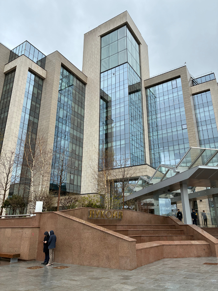 В прошлом году ПАО Лукойл один из первых начал сезон годовых отчетных собраний после долгого перерыва: И в этом году компания держит лидерство. Даже провёла собрание в конце апреля. До ковида так рано собрания проходили только у Московской Биржи и иногда ВТБ (это не считая НОВАТЭКа). ЛУКОЙЛ традиционно приглашает своих акционеров в центральный офис: Сретенский бульвар, 11, корпус «Вега», конференц-зал. Погода дождливая и весна затяжная- деревья у офиса еще голые (сравните с прошлогодней фотографией) Указатель на проход ко входу для акционеров: А вот и сам вход: Вроде все прозрачно, но некоторые акционеры жаловались, что входную дверь найти тяжело. Контроль безопасности был стандартный для ЛУКОЙЛа - много служивых, видимо то ли это такая ведомственная охрана, то ли подрядчики из МВД. Охранники на каждом повороте маршрута от входа до актового зала, чтобы пришедший акционер случайно не проник в другие помещения. Регистрация акционеров: Зал заседаний: Председательствующий, как и прошлом го