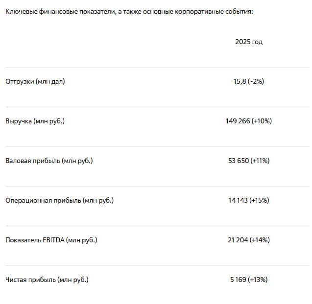 Алкогольный рынок в 2025 году скорее стагнировал по объемам, поэтому отчеты сектора сейчас логично смотреть через призму качества роста — за счет чего растут показатели и как меняется экономика бизнеса. Novabev Group уже отчиталась за 2025 год, посмотрим на ключевые результаты. 👉Ключевые финансовые результаты 2025 года ▪️Выручка: 149,3 млрд рублей (+10% г/г) ▪️Валовая прибыль: 53,7 млрд рублей (+11%) ▪️EBITDA: 21,2 млрд рублей (+14%), маржа 14,2% ▪️Чистая прибыль: 5,2 млрд рублей (+13%) Объемы отгрузок снизились на 2% до 15,8 млн, что показывает: рост идет не за счет количества, а за счет качества — ценовой политики и продуктового микса. 👉За счет чего растет бизнес Основной драйвер — смещение в премиальный сегмент. Быстрее всего росли более дорогие бренды: Orthodox (+53%), Troublemaker (+43%), Green Baboon (+21%). Компания также переориентируется на более ликвидные и маржинальные позиции — рост идет не через объем, а через стоимость. Второй драйвер — розница. Сеть ВинЛаба масшта