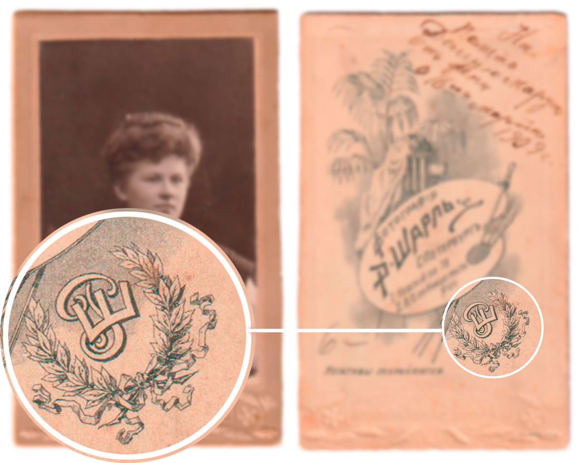 Рассматривая одну старинную фотографию я обратил внимание на интересное переплетение букв в окружении симпатичного венка. Данные буквы “Р” и “Ш” оказались инициалами фотографа и владельца фотоателье - Р. Шарля, а называется такое переплетение – вензелем. Вензель — это художественное переплетение начальных букв имени и фамилии , которые образуют сложный узор, зачастую с добавлением корон, венков и различных орнаментов. По сути вензель - это монограмма, только более изящная, художественная, с добавлением декора и составляющая с ним единое целое. Пересмотрев другие фотографии, я обнаружил большое разнообразие вензелей на них. Самый распространённый – это мантия с короной. Есть несколько видов, но все они схожи и имеют общий вид: мантия изображается в виде шатра (или балдахина), спускающегося из под короны. На самой мантии изображён вензель владельца фотографии. Таких вензелей большинство, “вписывались” как правило в шаблонные бланки и, вероятно, были самыми бюджетными. Если у фотографа