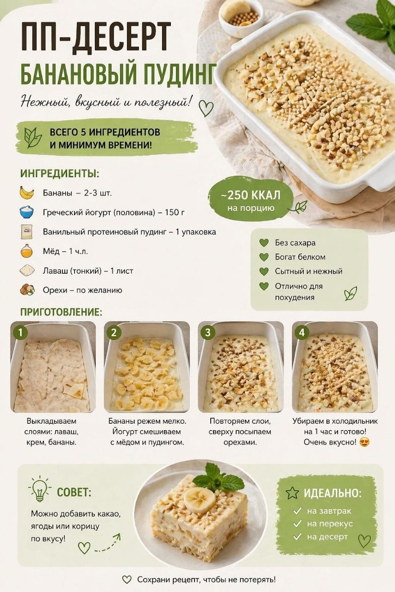 ) Нежный, сладкий и без вреда для фигуры 💚 Банановый пудинг с лавашем Ингредиенты: — бананы — 2–3 шт — греческий йогурт — 150 г — протеиновый (или обычный) пудинг — 1 упаковка — мёд — 1 ч. л. — лаваш — 1 лист — орехи (по желанию) Приготовление: 1. Нарежь бананы небольшими кусочками 2. Смешай йогурт с мёдом и пудингом 3. Выложи слоями: лаваш → крем → бананы 4. Повтори слои и посыпь орехами 5. Убери в холодильник на 1 час 💡 Совет: Можно добавить ягоды или какао для разнообразия вкуса Сохрани, чтобы не потерять ✔ #десерт