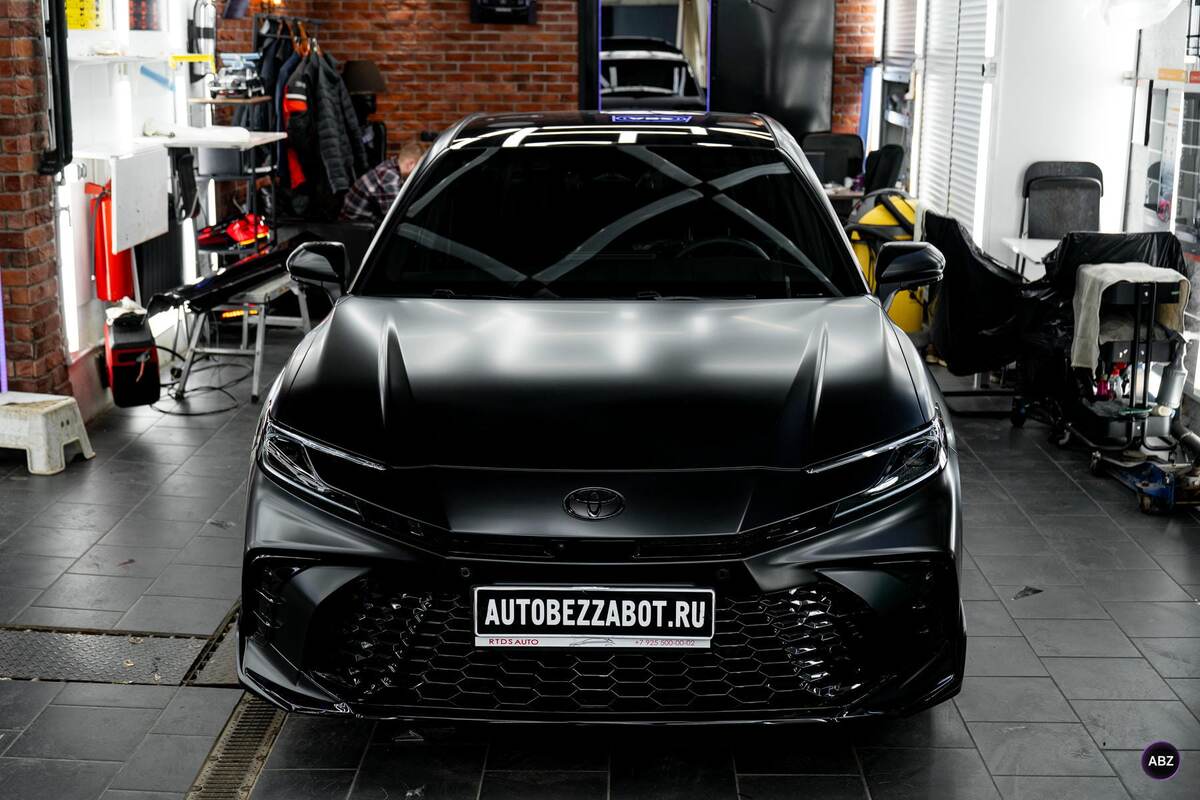 Сегодня расскажу вам о работе с Toyota Camry, автомобиле, который давно стал синонимом надёжности и спокойной эксплуатации. Camry выбирают за баланс: комфортный салон, мягкая подвеска, понятное управление и минимум сюрпризов в повседневной жизни. Это та машина, на которой просто ездишь и не задумываешься лишний раз. Но именно из-за активной ежедневной эксплуатации такие автомобили быстрее всего ловят сколы, царапины и следы от дороги. Поэтому логично сразу подумать о защите, чтобы потом не возвращаться к этому вопросу. Начали с основы — подготовили кузов к оклейке. Тщательная мойка, очистка поверхности, проверка состояния лака. Важно, чтобы перед нанесением плёнки поверхность была максимально чистой и ровной. После подготовки мы полностью оклеили кузов матовой полиуретановой плёнкой. Чёрный цвет в мате выглядит строже и спокойнее, при этом лучше скрывает мелкие следы эксплуатации. После оклейки мы нанесли специальный керамический состав на матовую плёнку. Это не про вне