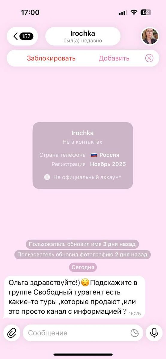 Эта девушка пишет подписчикам канала. Не общайтесь и не переходите ни по каким ссылкам. Если ты читаешь этот пост - можешь у меня спросить что и как…ну и явно я тут не туры продаю)