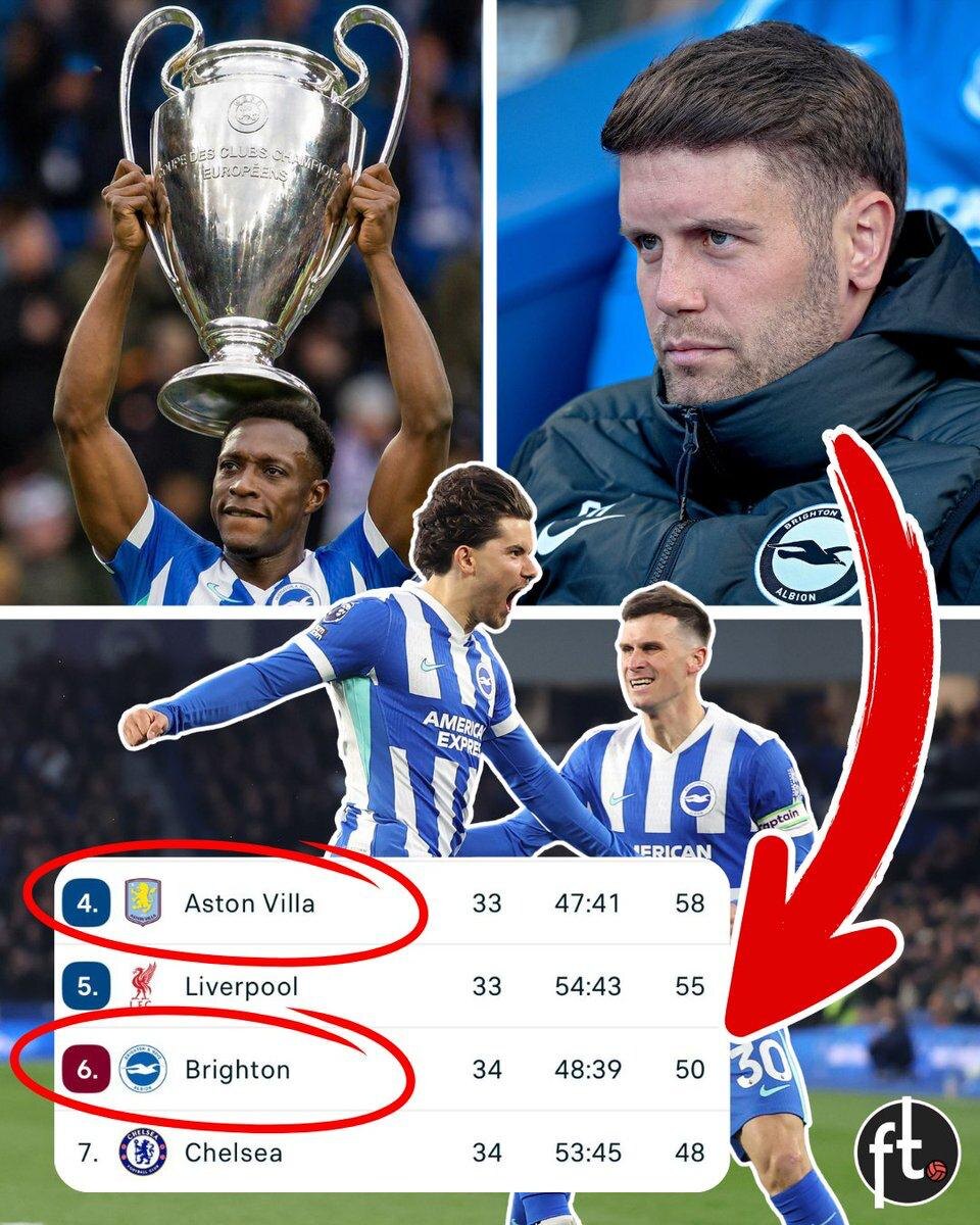 Если "Астон Вилла" выиграет Лигу Европы в этом сезоне и финиширует на пятом месте в Премьер-Лиге, то команда с шестой позиции — а это сейчас "Брайтон" — квалифицируется в Лигу Чемпионов 🏆