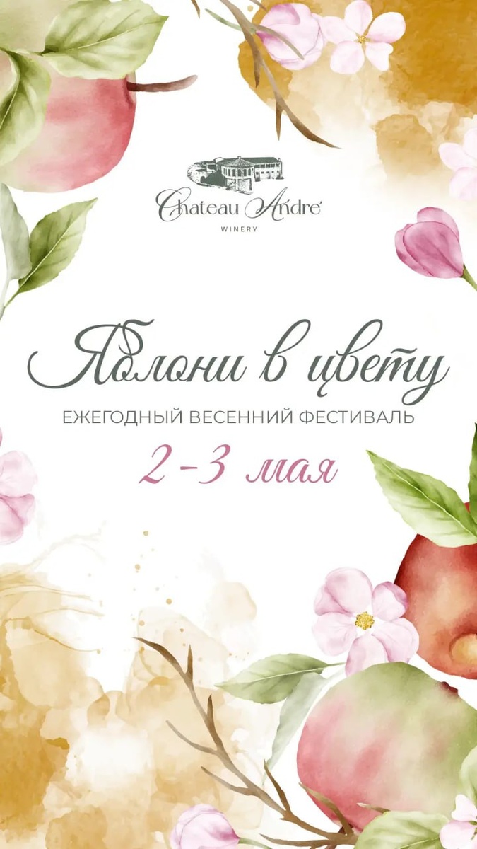 » В «Шато Андре» 2 – 3 мая пройдет традиционный фестиваль «Яблони в цвету». В программе: Забег Экскурсии Конкурс рисунков мелками Конкурс на лучшую маску «Весна» Выступление творческих коллективов и диджея Организаторы фестиваля предлагают гостям подготовить костюмы 60 – 70-х годов для еще более яркой атмосферы праздника. Некоторые услуги платные - по всем вопросам звоните: 88007074648.