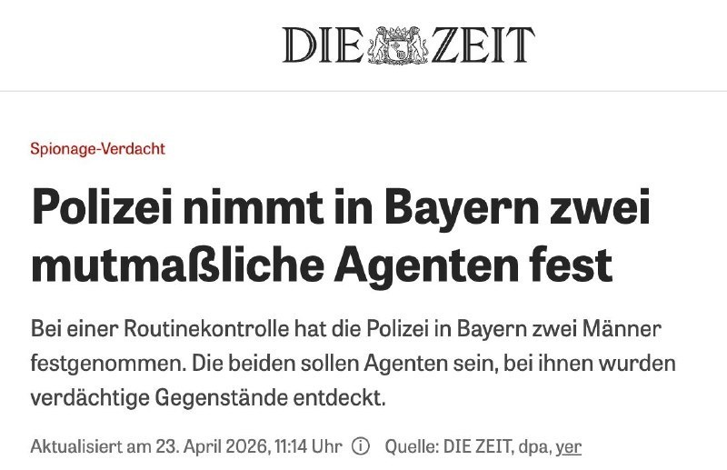 (Пишет Die Zeit) ▪️ При них были фальшивые документы, камеры, дрон, GPS-трекеры, рации, а также куча мобильников и SIM-карт. ▪️ Их поймали на трассе А6 в городе Нойендеттельзау. Оба уже под арестом. ▪️ Следствие считает: действовали они по заданию какой-то иностранной организации. Подписывайся