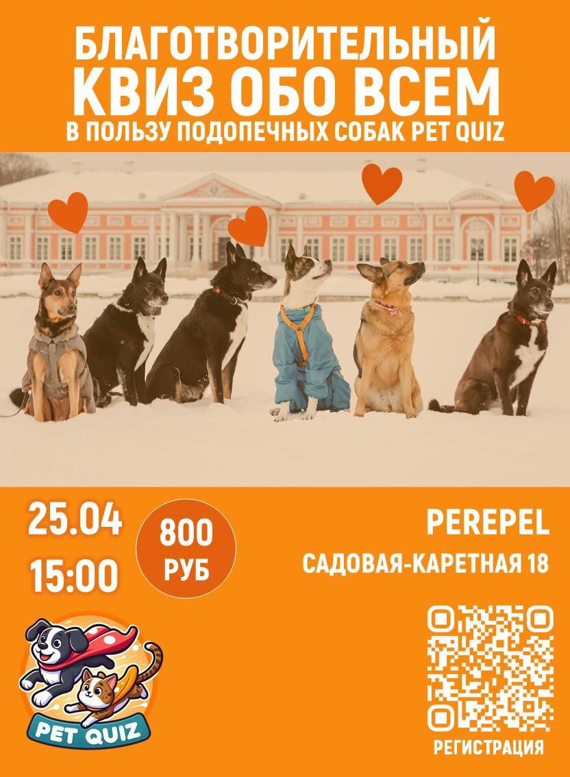 Проект Pet Quiz занимается организацией и проведением благотворительных квизов, до 100% доходов с которых направляется на помощь животным (как частным куратором и волонтёрам, так и приютам и фондам). Что такое квиз? Несколько команд, 7 разнообразных и веселых раундов по 6 вопросов. На игре работают фотограф и видеограф, команды советуются и отвечают, набирают баллы и всячески стремятся к победе, а победители получают подарки 🏆 Веселая и активная возможность помочь животным!🐶 📍Где и когда: 25.04 15:00 Perepel bar Садовая-Каретная 18 (ближайшие станции метро Цветной бульвар и Маяковская) Стоимость участия: 800 рублей с человека Регистрация на квиз: https://forms.gle/5ppCuQGvvmCTQwpJA