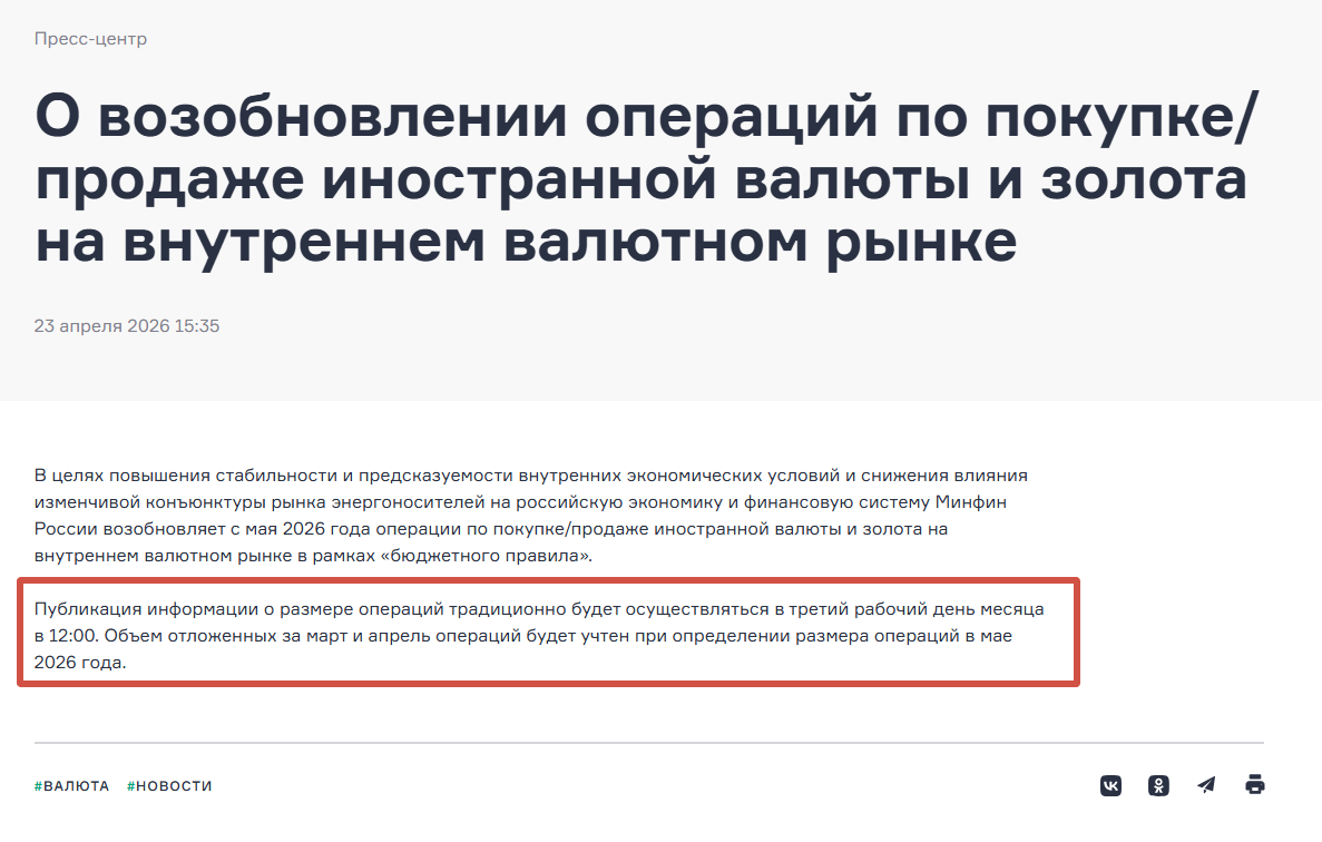 Только утром я опубликовал статью, где писал, что сейчас оптимальное время для покупки валюты и валютных активов, и предполагал, что Минфин не потерпит долго курса 75 рублей за доллар, именно от этой отметки будет его разворачивать, как это произошло буквально в этот же день! Минфин снова вышел с заявлением по поводу бюджетного правила, которое стимулировало разворот валютных курсов вверх, пока они выросли примерно на 1%, но это пока было лишь заявление о намерении, причем не совсем конкретное (дальше будет понятно). Но зато уже официальное. Итак, на официальном сайте ведомства (это не просто чье-то заявление, а официальный пресс-релиз) сегодня была опубликована информация, что Минфин возобновит операции покупки/продажи валюты и золота на внутреннем рынке по бюджетному правилу с мая. Судя по тому, что сейчас нефть торгуется дороже заложенной в бюджет цены отсечения (59 долларов), то это будут именно покупки. Причем, там было сказано, что при определении объема этих покупок будет учтен