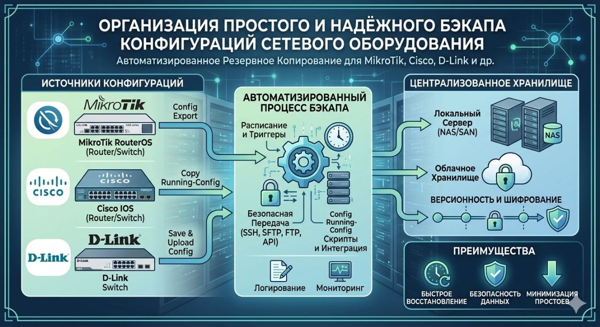 Мы рассмотрели три подхода к организации бэкапа конфигураций сетевого оборудования. От встроенных средств MikroTik, Cisco и D‑Link до централизованных систем (Oxidized, RANCID, Ansible) с контролем версий через Git и уведомлениями в Telegram. Бэкап конфигураций сетевого оборудования не требует больших затрат, но экономит часы простоя при аварии. Выбирайте подход, который соответствует размеру вашей сети и доступным ресурсам. Для небольшого офиса хватит встроенных средств и FTP сервера. Для десятков устройств используйте Oxidized или Ansible с Git репозиторием. Главное настроить автоматизацию и не полагаться на «ручной режим».