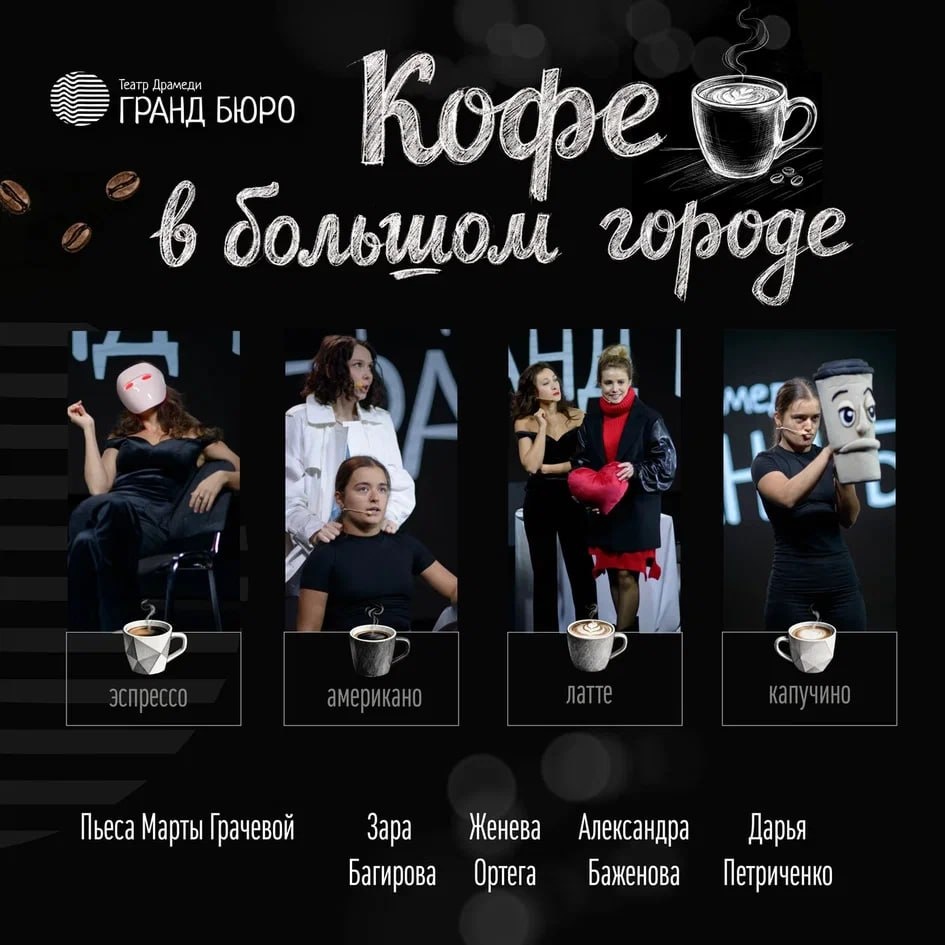 Подслушано в кофейне» 14+ Приглашаем вас на пронзительно искренний и теплый спектакль в стиле неоклассики, посвящённый современной жизни и культовому напитку, который сопровождает нас в этой суете. Каждый узнает в героинях себя, своих подруг или коллег. Это история о близком и понятном, рассказанная с легкостью и искромётным юмором. В уютной кофейне пересекаются жизни ярких персонажей. За чашкой кофе четыре подруги обсуждают все: от работы и брачных контрактов до травм детства и поиска любви. Пьеса состоит из трех актов: «Капучино», «Эспрессо» и «Латте». В каждом акте зрителей ждут остроумные шутки от Господина Сноба — куклы-стаканчика кофе, созданной художником легендарного театра Образцова. Спектакль представят артисты театра «Гранд Бюро» — лауреата премии при Государственной Думе РФ как «Лучший театральный проект года». Актеры: Александра Баженова, Женева Ортега, Зара Багирова, Дарья Петриченко Режиссер-постановщик: Марта Грачёва 🗓2 мая (сб) 17:00 🎫Билеты 📍Звенигородский м