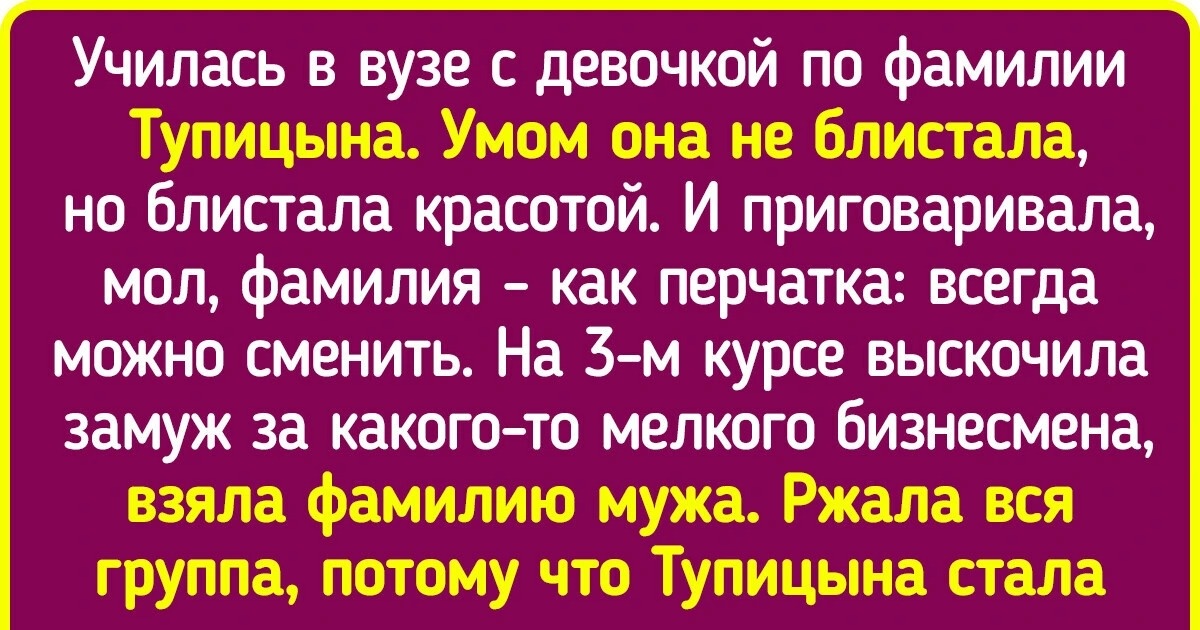 - Училась в вузе с девочкой по фамилии Тупицына. Умом она не блистала — блистала красотой и любила приговаривать, мол, фамилия — как перчатка: всегда можно сменить. Выскочила замуж на 3-м курсе за какого-то мелкого бизнесмена, взяла фамилию мужа. Ржала вся группа, потому что Тупицына стала Дурневой.