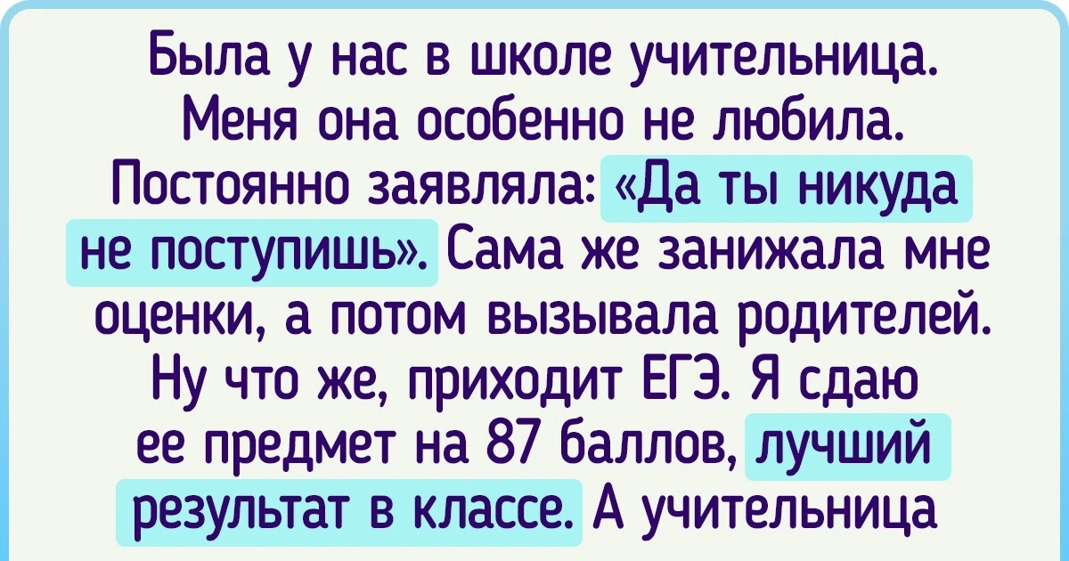 Была у нас в школе учительница. Меня она особенно не любила. Постоянно заявляла: «Да ты никуда не поступишь». Сама же занижала мне оценки, а потом вызывала родителей. Ну что же, приходит ЕГЭ. Я сдаю ее предмет на 87 баллов, лучший результат в классе. А учительница ни слова не сказала и, как я слышал, так и продолжает гнобить тех, кто ей не нравится. © AnatolySP / Pikabu