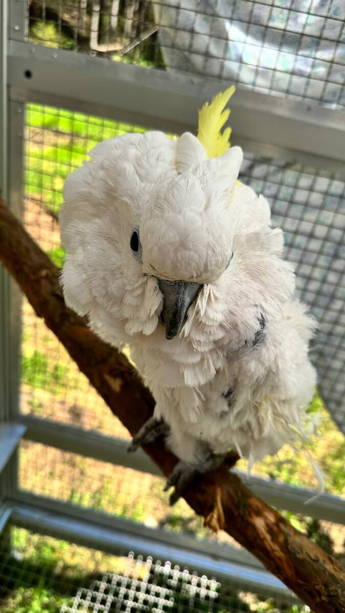 Нафаня, самка большого желтохохлого какаду подвида тритон. Фане уже 11 лет. Родилась она в Чешском питомнике, о чем и написано на её кольце. Истории как именно она попала в Россию нет, но чешские попугаи у нас совсем не редкость. Прошлая хозяйка Нафани выкупила её из очень плохих условий, где птица жила в очень прокуренном помещении. Несколько лет её лечили в Санкт-Петербурге. По обстоятельствам было принято решение передать её к нам и пробовать лечить у московских специалистов. Время идёт, но больших улучшений внешне по ней не заметно. У неё по прежнему сохраняется ощип, хотя обрасти она пытается практически постоянно. Особенно она не терпит свой хвост, стоит ему чутка подрасти и он в момент откусывается сразу весь. Это не психические проблемы или что-то такое, к сожалению это прямое следствие её проблем со здоровьем. Какое-то время у неё был перерыв в терапии и сейчас она снова получает лечение. В основном Фаня добрая птица, но в период жизни в вольере с ней был прикол, иногда она