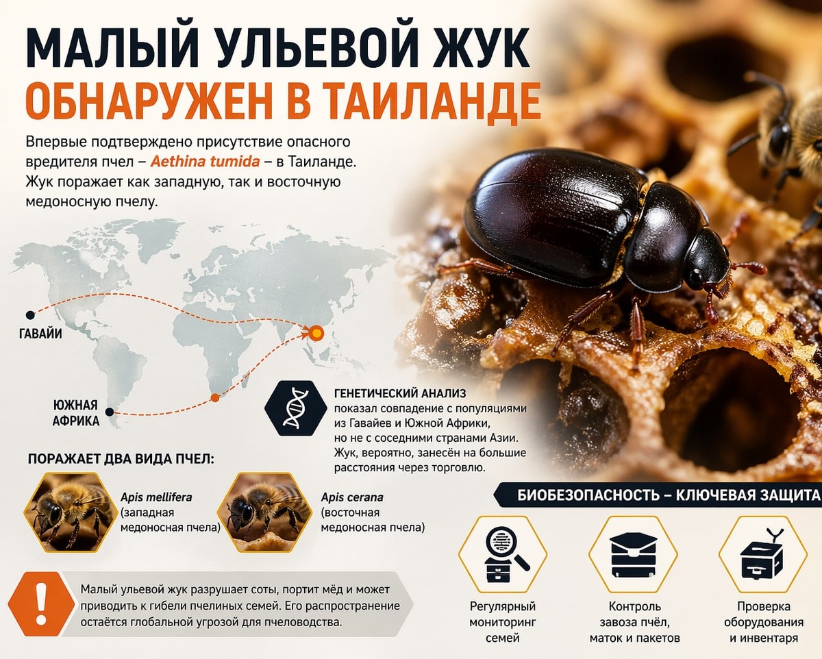 В Таиланде впервые официально зафиксирован малый ульевой жук — Aethina tumida, один из самых опасных вредителей пчелиных семей. Ранее он был эндемиком Африки, но за последние десятилетия превратился в глобального инвазивного паразита. Учёные подтвердили находку с помощью морфометрии и генетического анализа. Ключевой результат — происхождение новой популяции: ДНК жуков совпадает с образцами из Гавайев и Южной Африки, но не с уже известными очагами в Азии. Это означает, что вредитель был занесён в Таиланд на большие расстояния, вероятно через торговлю, а не распространился из соседних стран. Жук уже поражает как Apis mellifera, так и Apis cerana. Это особенно важно, поскольку показывает его способность адаптироваться к разным видам пчёл и системам пчеловодства. Малый ульевой жук разрушает соты, загрязняет мёд продуктами жизнедеятельности и может приводить к гибели семей. Появление нового очага в Юго-Восточной Азии подтверждает: его распространение остаётся неконтролируемым, а занос во