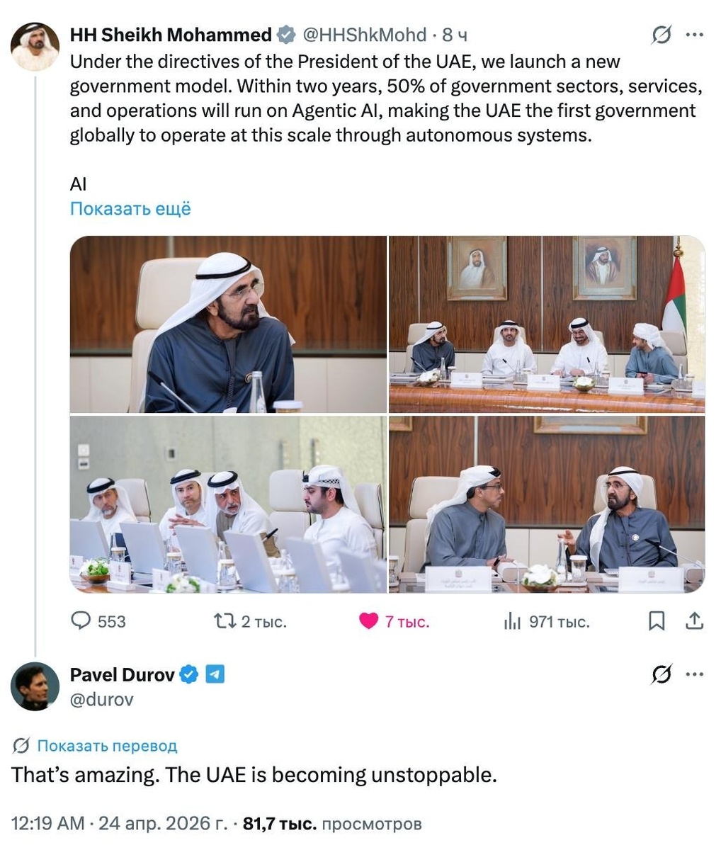 Уже через 2 года 50% всех госструктур, услуг и операций будут работать с помощью ИИ-агентов. В ОАЭ больше не считают, что ИИ — это только инструмент. Агентов сделают полноценными партнёрами в управлении страной. «Наш принцип остается неизменным. Люди на первом месте. Наша цель — правительство, которое быстрее, отзывчивее и эффективнее».