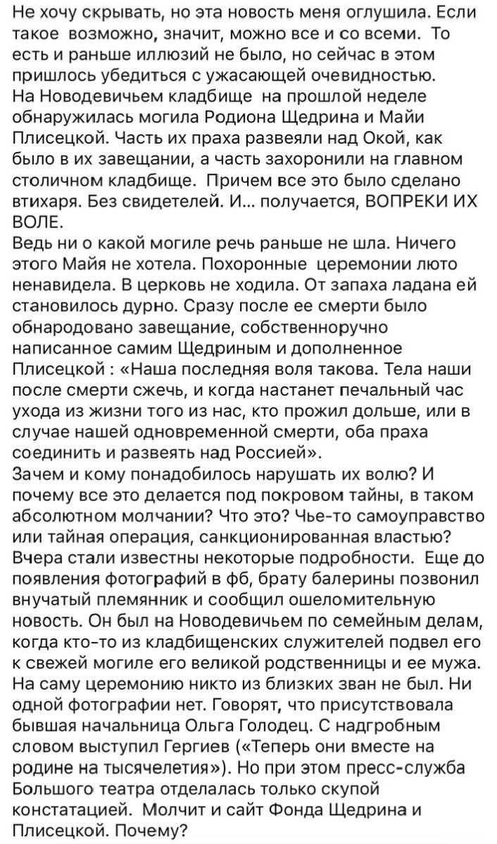 Брат Плисецкой знать не знал о том, что неизвестные нарушили волю Майи Михайловны и прикопали прах балерины и ее мужа Родиона Щедрина на