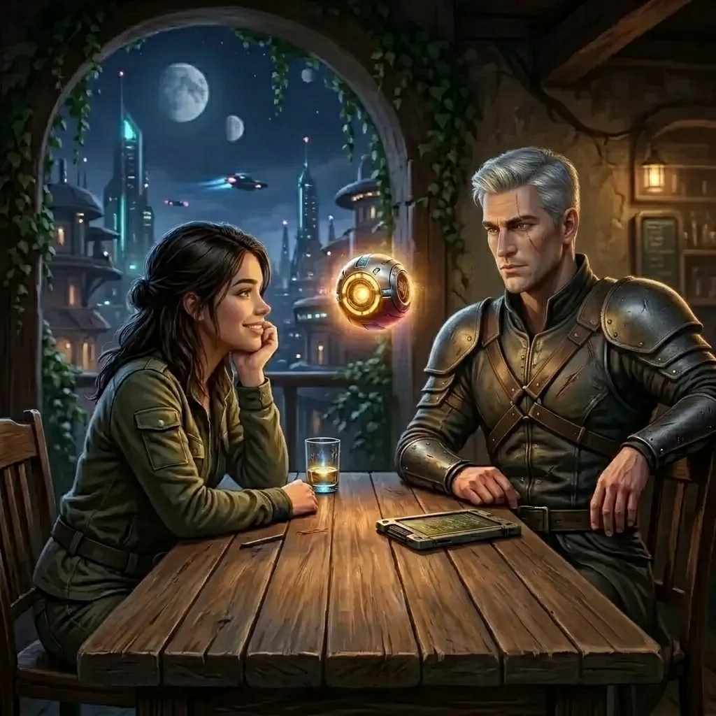 — А потом пришёл он, — Шнырь качнулся в сторону Альтаира, загораясь тёплым золотым. — Проходит мимо, останавливается, смотрит на меня и говорит: «Ты ещё живой, что ли?» А я ему: «Формально — нет! Но если у тебя завалялась энергоячейка...» И он достал ячейку, вставил в мой разъём и сказал: «Шныряй за мной». Так я стал Шнырём. И с тех пор — всегда с ним. Потому что он не бросает. Даже старую, бесполезную, болтливую сферу со свалки.