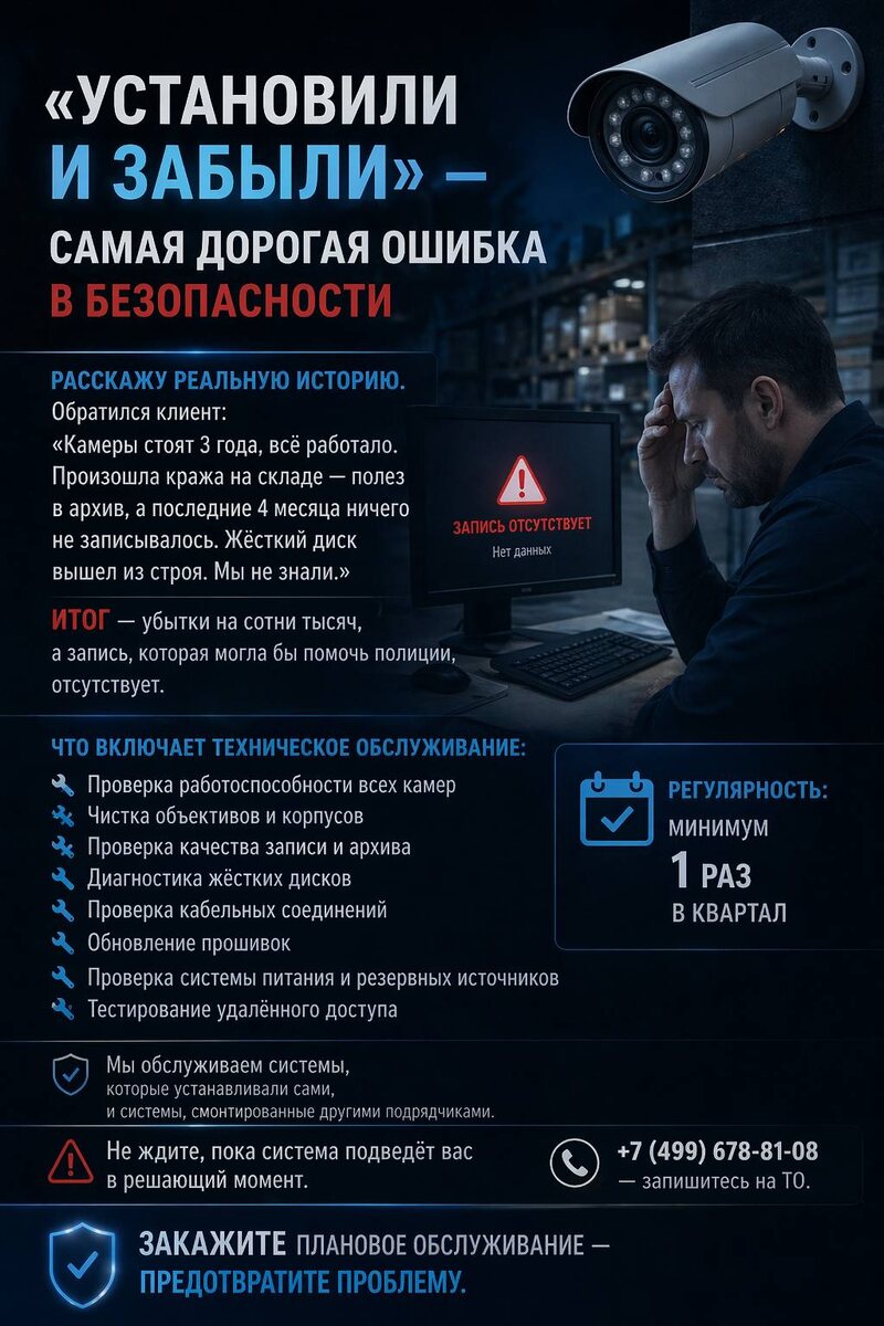 Ошибка, которую допускают многие владельцы бизнеса: установить систему видеонаблюдения и… забыть о ней. Клиент обратился с проблемой: камеры на складе были установлены 3 года назад и, по его словам, «всё работало». После кражи решили проверить архив — но оказалось, что записи отсутствуют уже 4 месяца. Причина — вышел из строя жёсткий диск, и никто этого не заметил. Система безопасности не может работать «сама по себе» годами без проверки. Даже надёжное оборудование требует регулярной диагностики. Оптимальная периодичность — не реже 1 раза в квартал. Это позволяет вовремя выявить проблемы и избежать критических сбоев. Мы обслуживаем: Самая дорогая ошибка — не поломка оборудования, а её незаметность. Не ждите, пока система подведёт в критический момент. Закажите плановое обслуживание и защитите свой бизнес от неожиданных потерь. Запишитесь на техническое обслуживание по тел.: +7 (499) 678-81-08 ➡️ Аналоговое vs IP-видеонаблюдение — что выбрать в 2026? ➡️ Видеонаблюдение для бизнеса: как