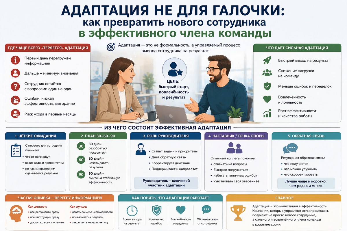 Это управляемый процесс вывода сотрудника на эффективность. Типичный сценарий: И через 1–2 месяца: Адаптация — это не про «познакомить»,