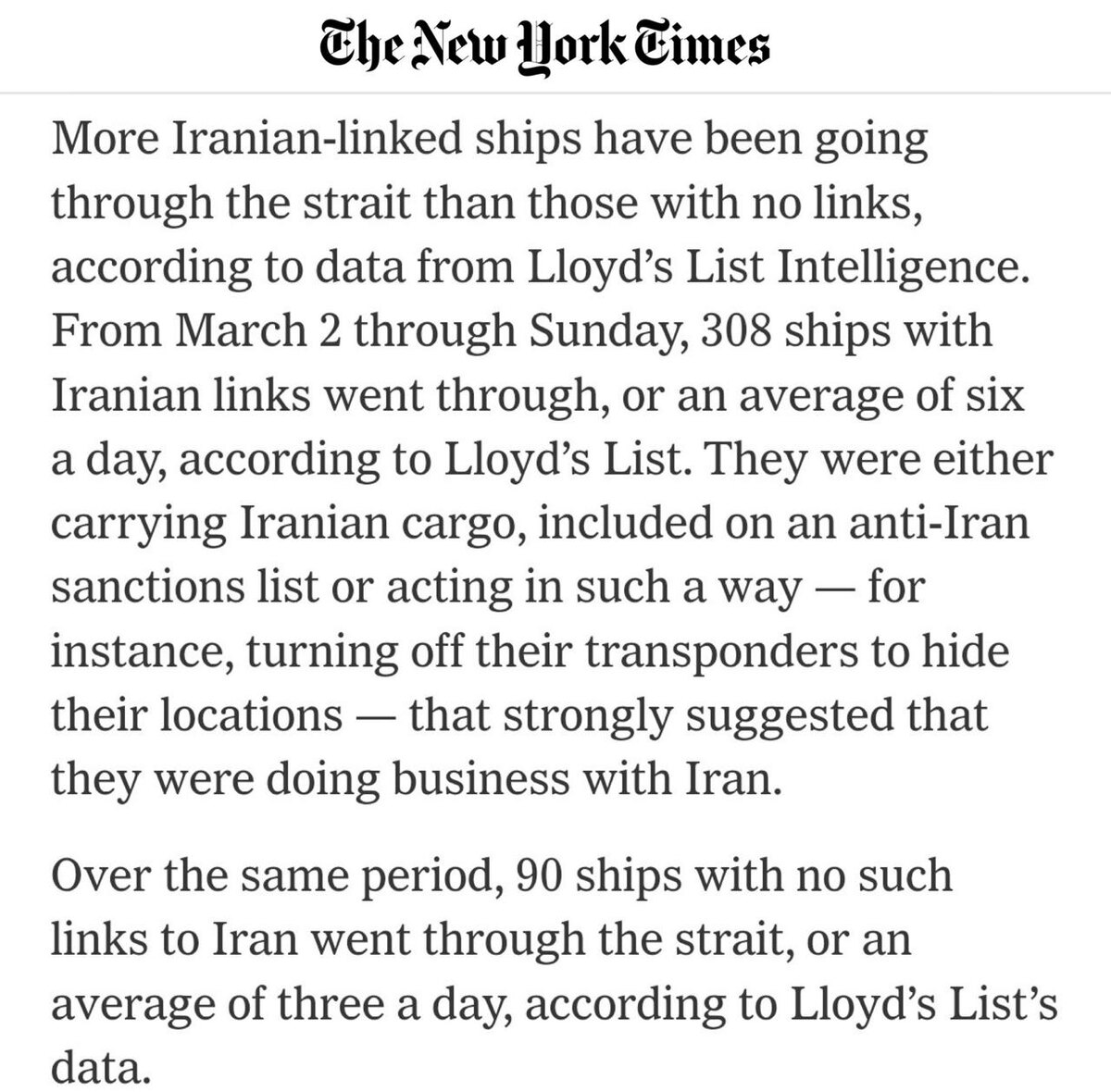 сохраняет контроль над Ормузским проливом и продолжает обеспечивать движение собственных поставок. С начала войны через пролив прошли 308 судов, связанных с Ираном — в среднем около шести в день. За тот же период лишь 90 судов, не связанных с Ираном, смогли пройти через пролив. Для прохода им приходилось получать разрешение Тегерана. Подписаться на канал в МАХ Подписаться на канал в ТГ Подписаться на канал в Rutube