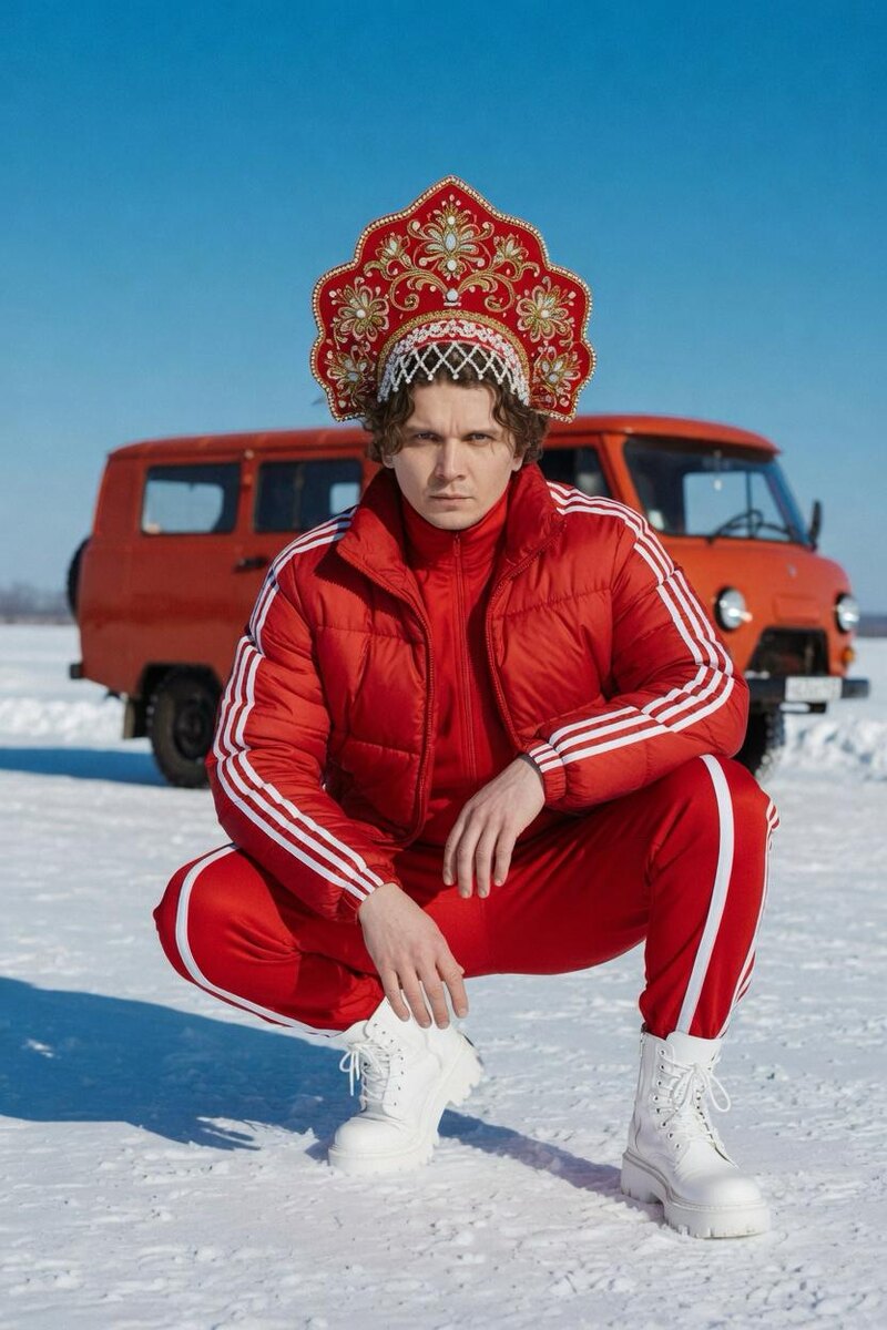 Ultra-realistic editorial portrait of a masculine man squatting low in a confident gopnik-style pose, arms resting on knees, looking directly into camera with calm intense expression. Wearing a full red Adidas tracksuit — red puffer jacket and matching red track pants both with bold white stripes down the sides. On his head a large ornate traditional Russian kokoshnik headdress — red velvet base embroidered with gold and white floral patterns, pearl and jewel details. Short beard, strong masculine jawline. White lace-up high platform chunky boots. Background: frozen snowy flat landscape, bright clear blue sky, vintage Soviet orange-red UAZ or Bukhanka van parked behind slightly out of focus. Harsh bright midday sunlight, sharp shadows on snow, vivid saturated colors — bold red against white snow and blue sky. Surreal clash of Soviet folk tradition and streetwear culture. Shot on 35mm, 50mm f/1.8, full-body squatting frame, shallow depth of field on background, 8K, hyperdetailed embroid