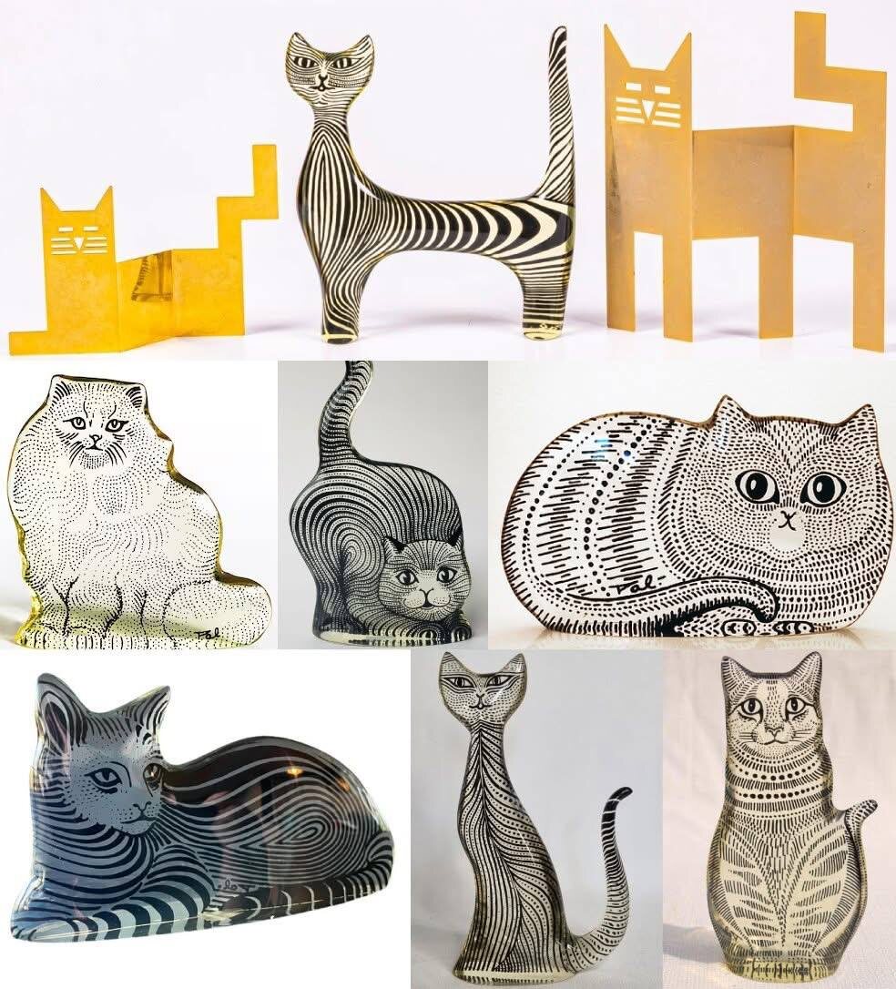 Стеклянные и латунные декоративные фигурки кошек бразильского художника Абрахама Палатника (Abraham Palatnik, 1928 – 2020), 1960-70-е годы.