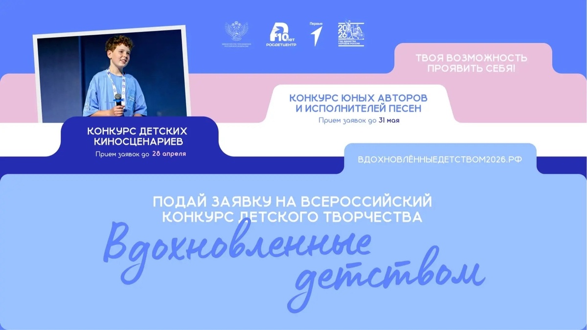 Действуй! Стартовал приём заявок на Всероссийский конкурс детского творчества «Вдохновленные детством». В этом году возможностей стало вдвое больше: 1. Всероссийский конкурс детских киносценариев Номинации: - фантастика (образы будущего страны); - история (прошлое страны); - драма (взаимоотношения людей и социальные темы); - комедия-приключения. Участниками каждой из номинаций станут обучающиеся в возрасте: - 7–11 лет (совместно с родителями); - 12–14 лет; - 15–17 лет. Приём заявок продлится до 28 апреля. 2. Всероссийский конкурс юных авторов и исполнителей песен Номинации: - индивидуальный; - дуэт; - группа (до 5 человек). Приём заявок продлится до 31 мая. Принять участие могут обучающиеся 7–17 лет (включительно). Переходи на сайт вдохновлённыедетством2026.рф и участвуй в конкурсе!