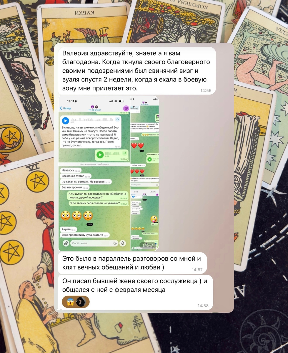Недавно мне написала девушка с четкими подозрениями в том, что ее мужчина ей изменяет... Она хотела понять что будет дальше в отношениях и честен ли с ней партнер. Я сделала расклад и там четко показало измены с его стороны, их формат, а также его выгоду в отношениях с девушкой. Позже она прислала мне обратную связь, а также переписки с подтверждением его неверности... Если ты хочешь знать правду, то следуй инструкции ниже: 1.Возьми колоду карт, если у тебя ее нет, то самое время сделать заказ на ВБ (арт. 39076761), или сделать онлайн расклад по ссылке https://vk.com/away.php?to=https%3A%2F%2Fwww.astrocentr.ru%2Findex.php%3Fprzd%3Dtaro%26str%3D3cards&utf=1 2. Теперь посмотри на фото того, кого хочешь проверить, и задай вопрос картам: «Изменяет ли (его имя, возраст) своей девушке (имя, возраст, даже если мы задаем вопрос про себя, то точно также смотрим на свое фото и учитываем все данные)?» 3. Выложи 3 карты и смотри есть ли среди них те, которые я описала ниже: Шут 0 Одноразовые случа