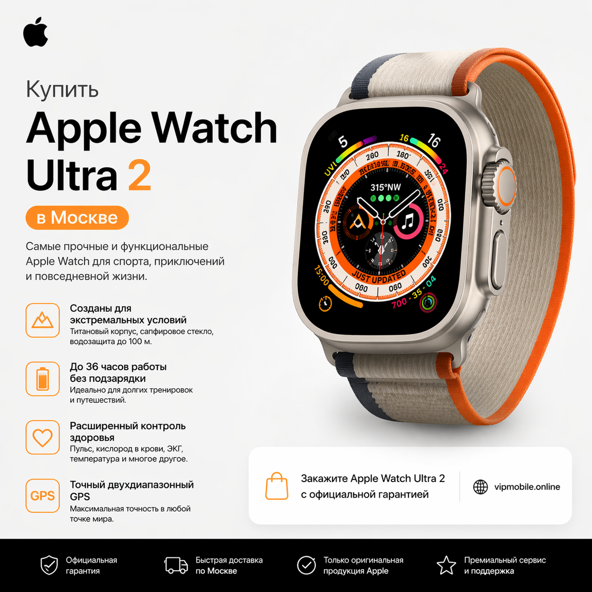 Ссылка на наш Интернет магазин https://vipmobile.online/product-category/umniye_chasy_i_braslety/umnye_chasy/apple_watch_/chasy_apple_watch_ultra_2/ Apple Watch Ultra 2 — это самые передовые и функциональные умные часы для тех, кто ценит активный образ жизни, приключения и спортивные достижения. Эти часы созданы для экстремальных условий с прочным титановым корпусом и сапфировым стеклом, способным выдерживать любые нагрузки. Apple Watch Ultra 2 идеально подойдут для тренировок, путешествий и повседневного использования. С помощью Apple Watch Ultra 2 вы можете следить за своим здоровьем в реальном времени, включая контроль пульса, уровня кислорода в крови и температуры тела. Часы оснащены точным двухдиапазонным GPS, который позволяет отслеживать ваши маршруты с максимальной точностью. Благодаря огромной батарее, Apple Watch Ultra 2 могут работать до 36 часов без подзарядки, что идеально подходит для длительных поездок и активных дней. Эти часы обладают ярким дисплеем, который легко чит