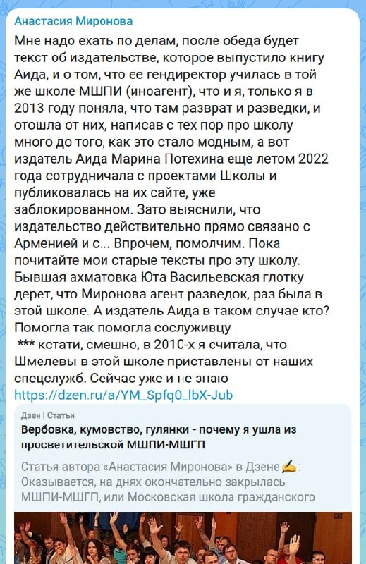 Ни дня без меня сталкерша прожить не может. 🧐🧐🧐Пишет, Я глотку деру из-за того, что Мирониха училась в школе иноагенте. Какая-то *МШПИ-МШГП. Снова у бабы галюки, ибо слышу я это впервые и именно от неё. Но: «Гуд ту ноу, мисстресс Миронова. Спасибо за информацию. Приобщим к биографии обязательно». Исходя из её текстов за 6 месяцев и заявлений, сколько раз она звонила и ходила в то самое «ФСБ», там наверное уже давно пометили её как серийного доносителя-фантаста. Я же это не придумала, а всего лишь читала бесконечные посты с воплями куни о том, как она обрывала фейсам телефоны, писала на всех подряд донос за доносом, об этом целую комедию написать можно со ссылками на её же брехню. Тут либо у сотрудников есть папка «Психически больные», либо не было ни одного доноса, и всё, о чем мы читаем уже полгода, — психически больные фантазии и галлюцинации потомка убийцы Павлика Морозова. КОМУ ты вообще нужна, Миронова? Кроме психиатра? 😈 А вот за инфу об учебе в школе, связанной с брита