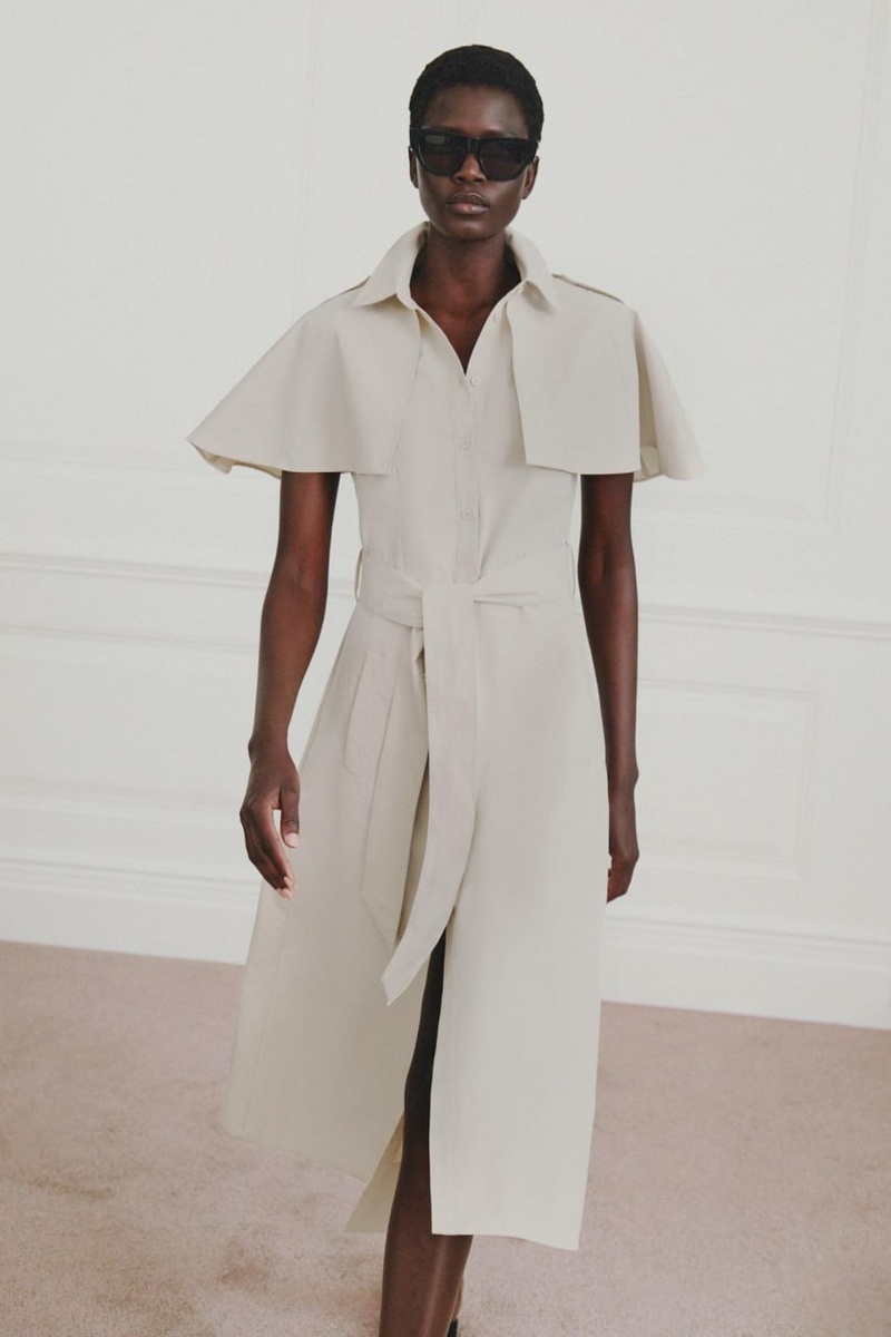 и не только. Кейп, наподобие отлетной детали плаща. На самом деле, если присмотреться, это размоделированая полочка и спинка с рукавом реглан, отрезанные на уровне линии проймы ( ниже на 3-4 см) и расширенная в стороны по нижнему срезу. Хотя на модели заметен, один недочёт: погоны " улетели " назад, это значит что расширение сделали неравномерное и линия плечевого шва ушла назад.