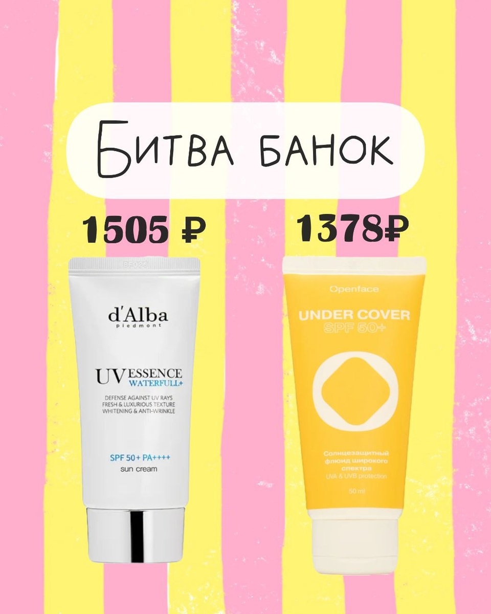 Сегодня на ринге: D’Alba Waterfull Essence против Openface Under Cover Корейская роскошь с эффектом влажной кожи против российской рабочей лошадки, которая просто делает свою работу и не устраивает драму на лице. Спойлер сразу: победа снова за нашей баночкой D’Alba это история про красивую упаковку, влажное сияние и ощущение: я дорогая женщина в отпуске Openface это про спокойную кожу, отсутствие раздражения и нормальный SPF без сюрпризов Начнем с фильтров. У D’Alba защита действительно хорошая: есть современные стабилизаторы Uvinul A Plus, Uvinul T150 и Tinosorb M. Но вместе с ними идут старые спорные фильтры: Octinoxate и Homosalate. Именно к ним у косметологов чаще всего возникают вопросы из-за возможной раздражающей и спорной эндокринной активности У Openface состав чище: Tinosorb S, Uvinul A Plus, Ensulizole и Octisalate. Без Octinoxate, без Homosalate, без Octocrylene. Фильтры современные, фотостабильные и гораздо спокойнее для кожи. Уже здесь плюс в сторону нашего Теперь