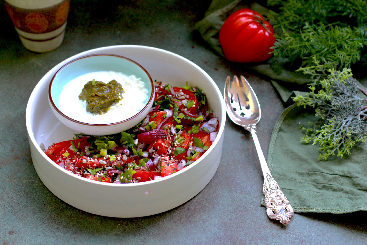 Овощной салат с заправкой из зерненного творога в сливках и соусом песто