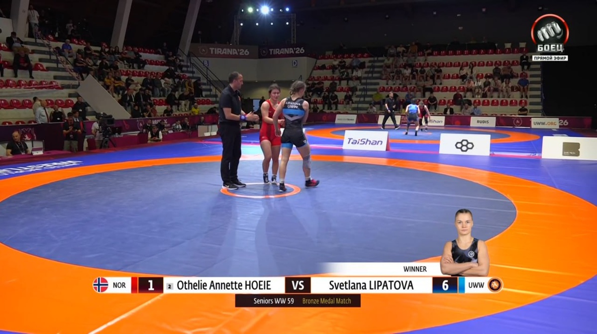 Светлана Липатова забирает медаль в схватке с норвежкой Хойе 💪