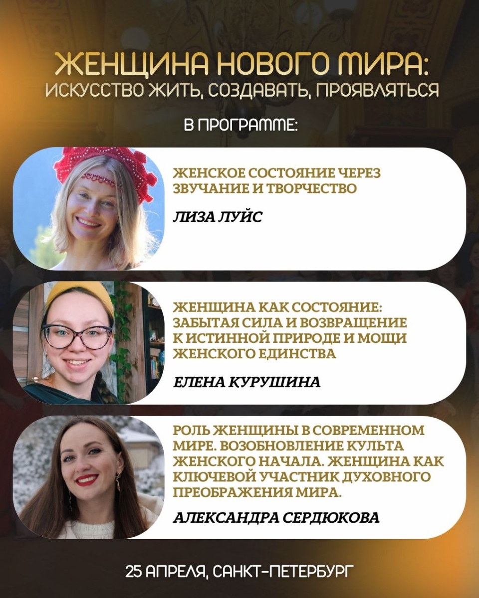 6️⃣ Лиза Луйс - поэт, певица, автор песен ✔️Лауреат Национальной литературной премии «Золотое перо Руси» ✔️Автор нейрозвукового метода возрождения жизненной силы через голос «Живопение» Тема выступления: Женское состояние через звучание и творчество На мероприятии Лиза исполнит композиции из нового альбома «Древо Рода», записанного совместно с музыкантом Кириллом Богомиловым, автором музыки к фильмам «Холоп» и «Последний богатырь». Эти животворящие песни родились на берегах священной Ладоги, где Лизе открылись истоки культурного кода славянской Руси. 7️⃣ Елена Курушина - альтернативный исследователь истории и культурных кодов ✔️Автор проекта «БаняВЕДАние = Экскурсия в себя» ✔️Проводник трансформационных практик и авторских экскурсий по Санкт-Петербургу, выходящих за рамки учебников и привычных представлений Тема выступления: Женщина как состояние: забытая сила и возвращение к истинной природе и мощи женского единства О том, как вернуть себе ту силу, которая была у наших предков и