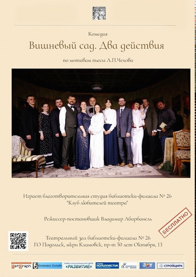 ” по мотивам комедии А.П.Чехова. Бесплатные пригласительные билеты можно получить на взрослом абонементе библиотеки №26. 🚫 Возраст: 12+ 📆 26.04.2026 🕕 17:00 🏢 Библиотека № 26 Климовск 📍 г.о. Подольск, мкр-н Климовск, пр-т 50 лет Октября, 13 ⭐Поддержать канал голосом 🍰Где поесть в Подольске ✅ Мероприятия Подольск https://dzen.ru/id/66ed500f7b5671493eca3fd6 https://vk.ru/podolsk_events http://dzen.ru/podolsk_events