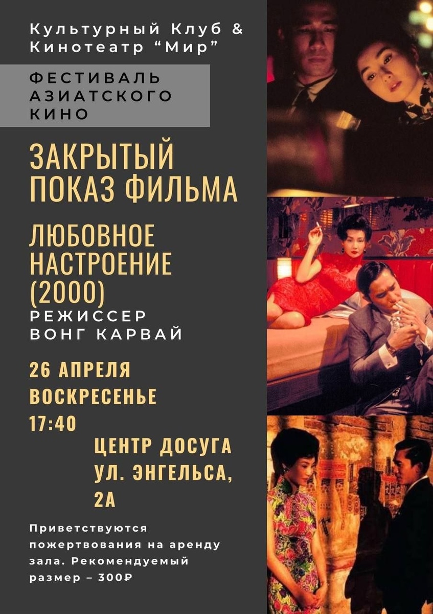 ). Когда: 26 апреля, в воскресенье, в 17:40 Где: Центр досуга, ул. Энгельса, 2а Продолжительность фильма: 1 ч. 40 мин. Безусловно, Вонг Карвай уже много лет считается мастером элегического жанра. Его фильмы отличает простота сюжета, естественность и деликатность в изображении чувств, визуальный эстетизм и немногословное повествование. «Любовное настроение» — творческая вершина его изысканно-меланхоличного стиля. Двое живут в квартирах по соседству. Его жена редко бывает дома. Ее муж все время находится в командировке. Но мы никогда не увидим ни ее мужа, ни его жену. Главное — он и она. Два разбитых сердца. Две печальные души… Фильм для настоящих эстетов! 📍Вход за пожертвования на аренду зала. Рекомендуемая сумма – 300₽