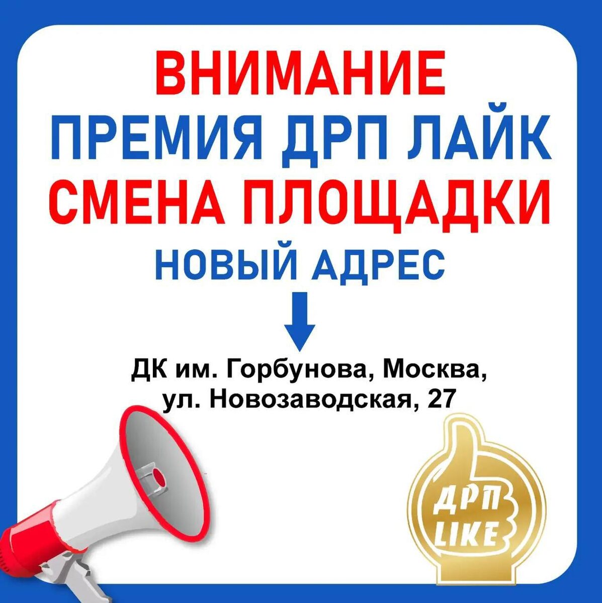 ️⃣ Дорогие друзья! В связи с большим количеством зарегистрированных гостей, принято решение об измении места проведения Х ПРЕМИИ ДРП LIKE! 📍Премия пройдет в ДК им. ГОРБУНОВА ❗️ВАЖНО❗️ В ДК им. Горбунова запрещен вход с напитками и едой, но будет работать БУФЕТ❗️ 📆Когда: 25 апреля ⏰Во сколько: в 12:00 📍Где: ДК им. Горбунова, Москва, ул. Новозаводская, 27 (метро "Багратионовская") Мы рады видеть всех!