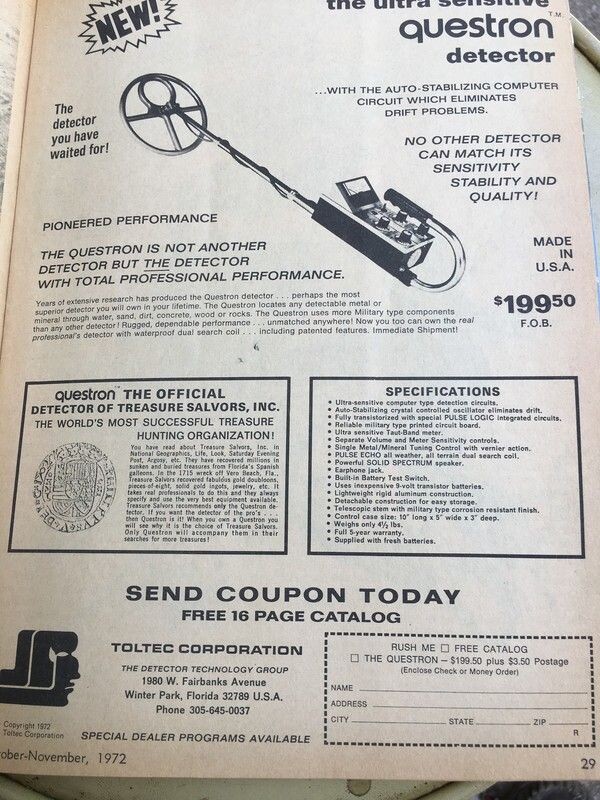 В начале 70-х, когда большинство детекторов были капризными и нестабильными, компания Toltec выпустила Questron. Его реклама была повсюду: от технических журналов до специализированных изданий для искателей сокровищ. Главная фишка Questron — это Pulse Logic и полная кварцевая стабилизация. В эпоху аналоговых схем, которые «плыли» от любого изменения температуры, этот прибор держал настройки как вкопанный. Questron официально использовался компанией Treasure Salvors, Inc., которая подняла золото с легендарного галеона «Аточа». Это была лучшая реклама, которую можно купить за деньги. Корпус из жесткого авиационного алюминия и компоненты «военного» типа делали его прибором для суровых условий, а не просто прогулок по полю. 10-дюймовая катушка обеспечивала отличный захват площади и глубину, недосягаемую для дешевых TR-приборов того времени. Сходство между Questron и Teknetics Coin Computer Mark 1 не случайно — это была эпоха активного заимствования форм-факторов и поиска идеальной эргоном