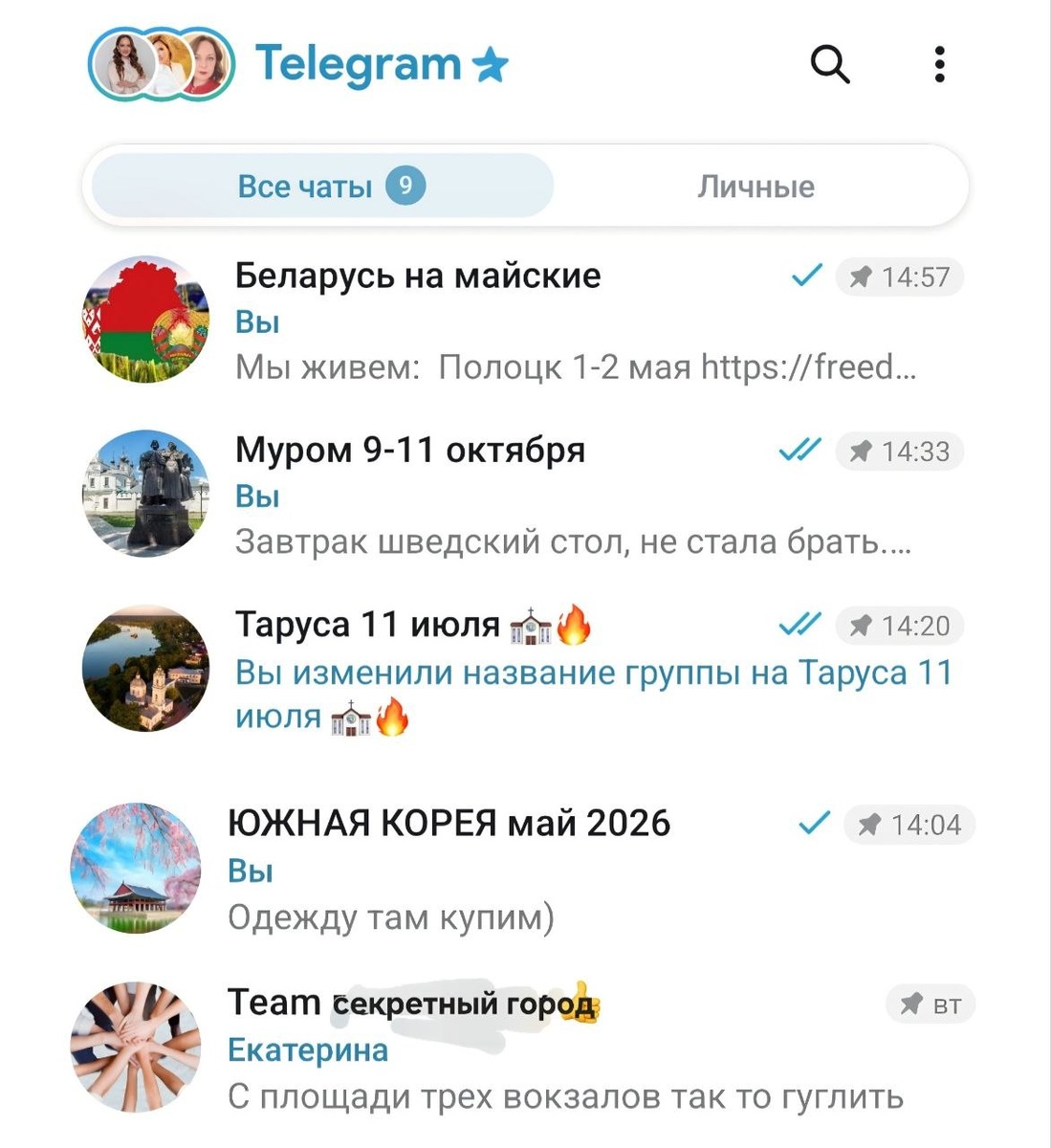☝️😁 Как не запутаться в своих поездках. 🗓 Часто я параллельно планирую несколько путешествий разными составами. И чтобы все были в курсе планов, мы создаем группы в ТГ, кидаем туда билеты, брони, обсуждаем планы. Очень удобно! Там же во время поездки обмениваемся фотографиями и решаем организационные вопросы. 👯 Когда той же компанией собираемся в следующую поездку, меняем название и фото группы и продолжаем ленту. 🏪 Но есть и стационарные группы, например, у меня Team с коллегами, в ней мы общаемся по нерабочим вопросам и нашим совместным поездкам, которые у нас традиционно 2 раза в год. 🙊 Сейчас планируем с ними путешествие в конце мая, уже куплены билеты и отель, но девочки мои не знают, куда мы едем 🤣 Только время примерное и что от метро Комсомольская отчаливаем. Пытаются угадать, но мы со вторым организатором решили, что до встречи на перроне не раскроем тайну. А вы бы хотели в такую поездку? 😢Попробуйте угадать город, пишите в комментарии версии. Кто даст верный отв
