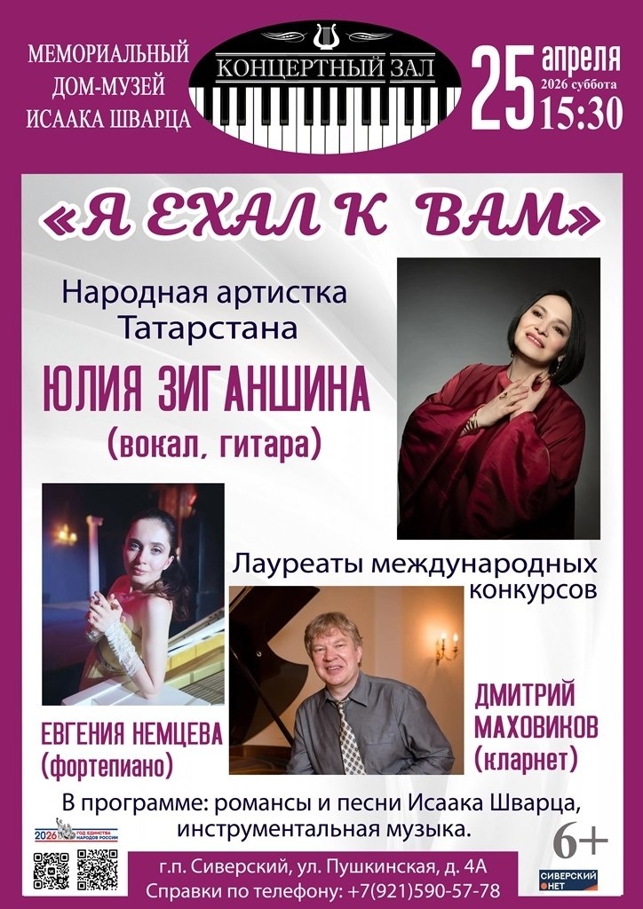 25 АПРЕЛЯ 2026 года / 15:30 / / «Я ЕХАЛ К ВАМ»🎼🎶 / 4 апреля Светлана Захарова открыла серию концертов весенне-летнего сезона, посвященных Исааку Шварцу. 25 апреля - концерт «Я ехал к Вам». На сцену в этот вечер выйдут: народная артистка Татарстана, лауреат международного конкурса «Романсиада» ✅ Юлия ЗИГАНШИНА (вокал, гитара), лауреаты международных конкурсов ✅ Евгения НЕМЦЕВА (фортепиано) ✅ Дмитрий МАХОВИКОВ (кларнет). Чистый мощный голос, безупречный вкус в выборе репертуара, сценическая культура и обаяние – обладая этими достоинствами, Юлия Зиганшина продолжает традиции высокой вокальной культуры России. Причём, делает это легко, ярко, самобытно. Юлия Зиганшина исполняет романсы и песни проникновенно, тонко. Классическое музыкальное образование и сценическая культура определили стиль и жанр этой замечательной певицы. Городской романс и лирическая песня в их традиционной форме маленького спектакля о любви, ревности, сердечной дружбе, Показать полностью... Источник: Открыть