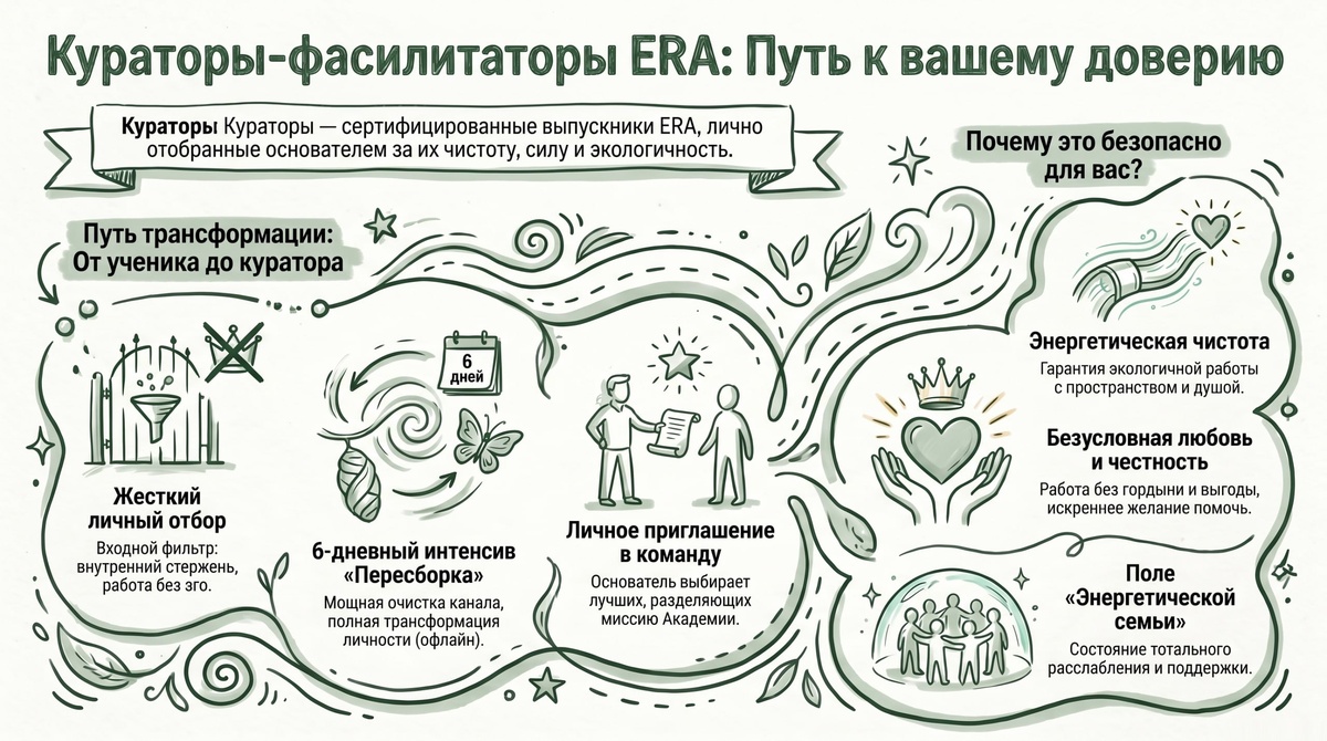 ? 🤍 Вы часто спрашиваете, кто те бережные проводники, которые ведут вас в наших практикумах (например, в «Разговоре с Душой») и помогают на сессиях. Давайте знакомиться ближе! Кураторы-фасилитаторы — это не просто приглашенные специалисты со стороны. Все они — сертифицированные выпускники Академии ERA. Как вы знаете, попасть на мое обучение может далеко не каждый. Я провожу очень жесткий личный отбор. Чтобы зайти в эту трансформацию, человек должен обладать внутренним стержнем, открытым сердцем и абсолютной готовностью снять «корону» эго. Наши кураторы успешно прошли этот начальный фильтр, а затем выдержали мощнейший 6-дневный офлайн-интенсив — тот самый «тренинг в тренинге», где их канал полностью очистили, а личность пересобрали заново. Это значит, что каждый наш куратор — это невероятно сильный, чистый и глубокий фасилитатор, за работу которого я могу смело ручаться и отвечать головой. Я точно знаю их уникальный потенциал, их энергетические мощности и то, насколько безопасно
