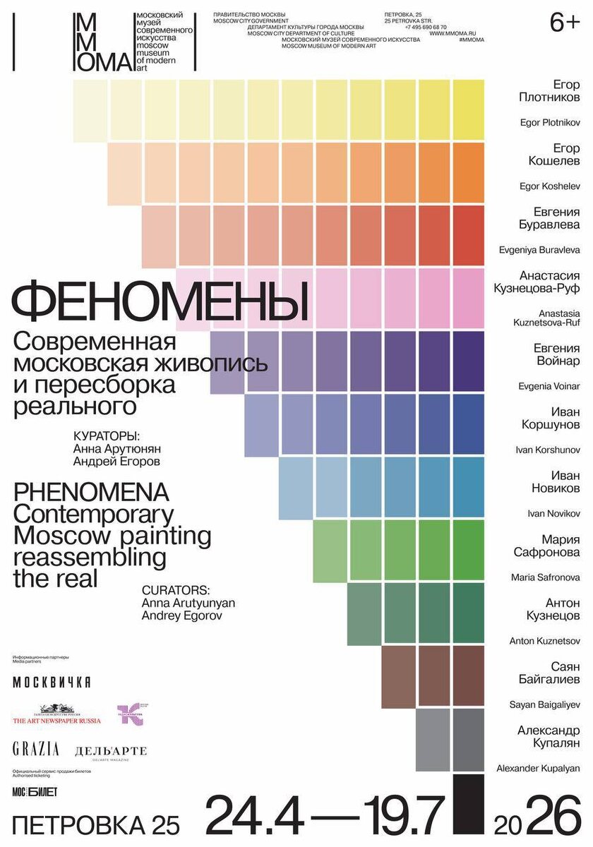 Современная московская живопись и пересборкареального Даты проведения: 24 апреля — 19 июля 2026 Площадка: Петровка, 25 Кураторы: Анна Арутюнян, Андрей Егоров Участники выставки: Егор Плотников, Егор Кошелев, Евгения Буравлева, Анастасия Кузнецова-Руф, Евгения Войнар, Иван Коршунов, Иван Новиков, Антон Кузнецов, Мария Сафронова, Саян Байгалиев, Александр Купалян Московский музей современного искусства представляет выставку «Феномены», которая посвящена возвращению на актуальную сцену классической в своей основе живописи, убедительно воплощающей образ и нерв современности. Не отрицая, как было еще совсем недавно, собственное прошлое, признавая самоценность картины, ее поверхности, такая живопись не коснеет в многовековой традиции, но чутко откликается на технологические и экзистенциальные вызовы нашего времени. В эпоху совершенствующегося искусственного интеллекта, в нескончаемом потоке цифрового контента, она оказывается действенным инструментом уникального, искреннего и осмысленного