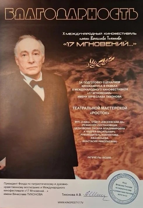 военно-историческое общества. Нашему театральному коллективу "Творческая мастерская "Росток" была вручена благодарность за патриотический сценарий "Ожившая фотография". Благодарность получили из рук Анны Тихоновой, дочери нашего земляка, а также российского историка, доктора исторических наук, профессора , научного директора Российского военно-историческое общества Михаила Мягкова и директора по коммуникациям кинокомпании "Триикс медиа" Святослава Жаданова. #ПавловскийПосад #Росток #Росток_ПП #ПавловскийПосад #НашеПодмосковье #17мгновений #Тихонов